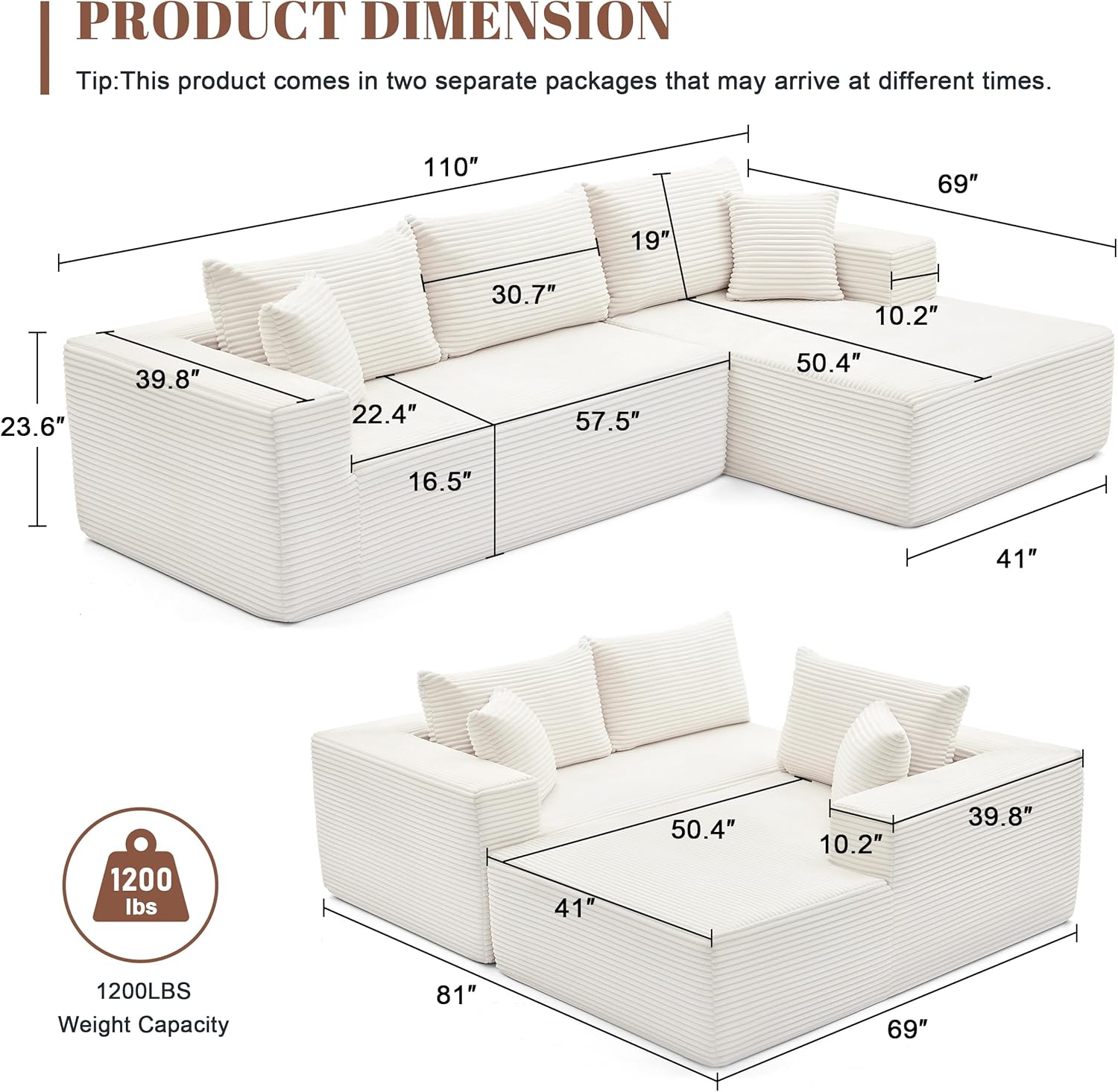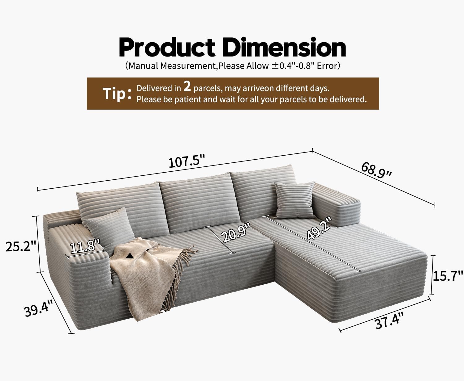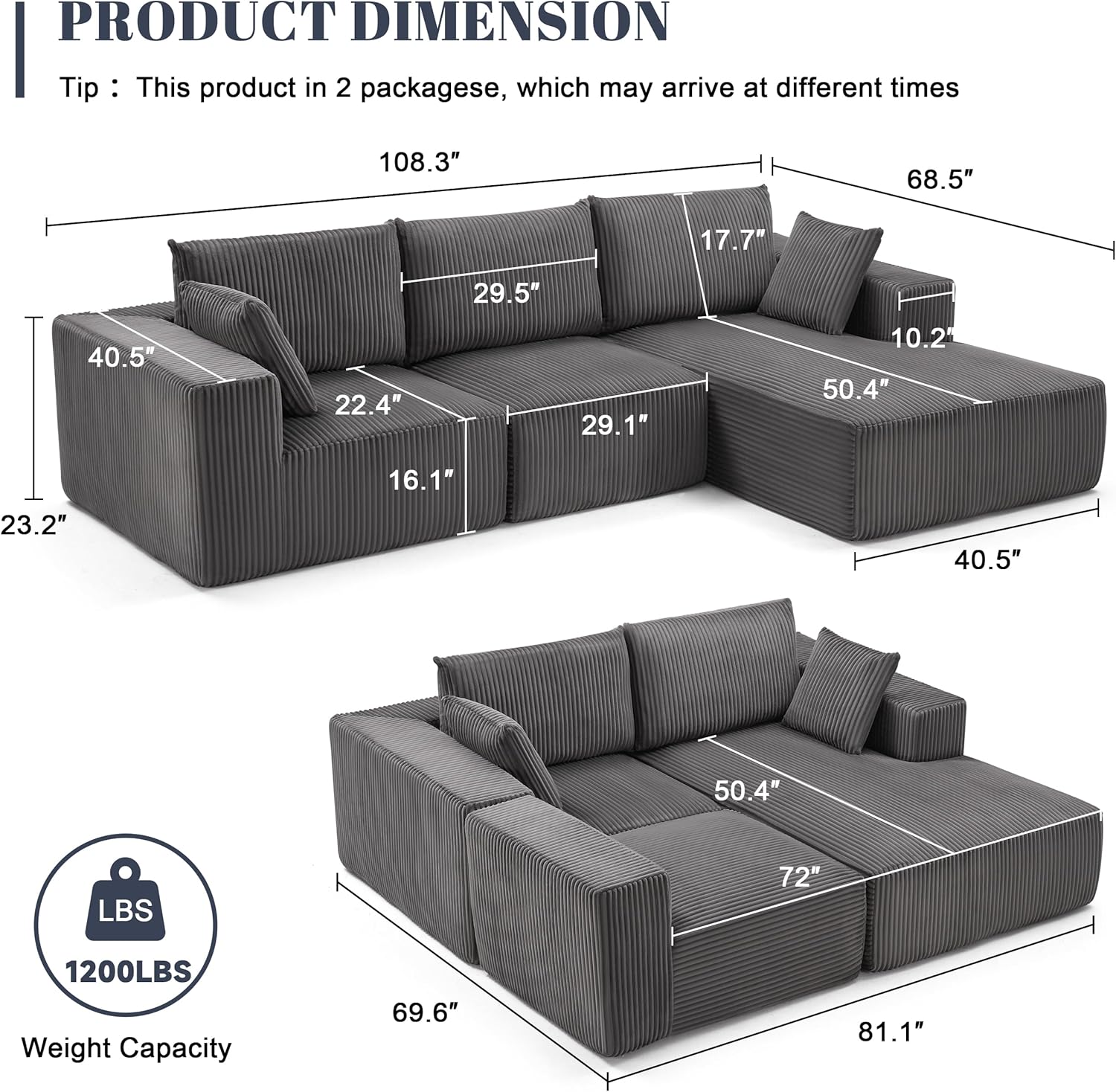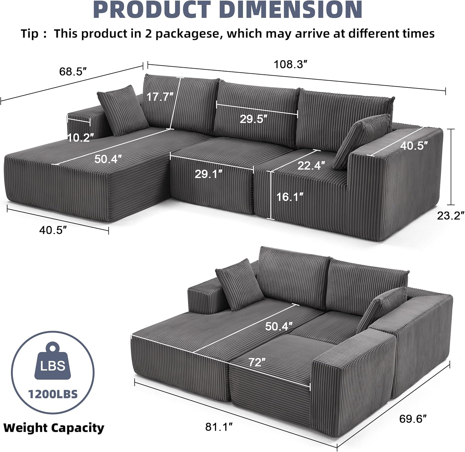 107.5 inch Cloud Modular Sectional Sofa with L-Shaped Chaise Lounge, Modern Minimalist Upholstered Sofa Deep Seating Corner Sofa