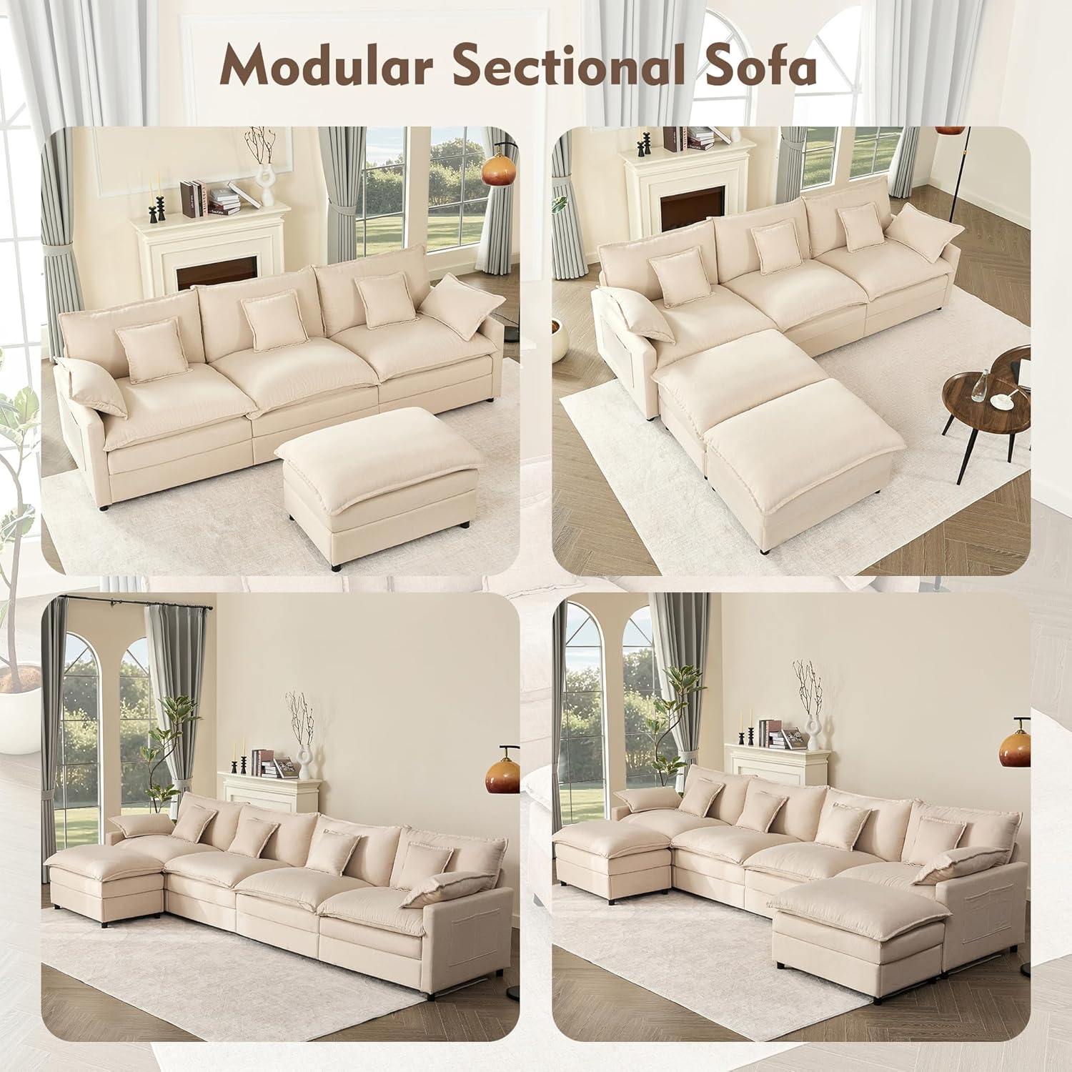 108 Inch U Shape Sofa, Sectional Sofa, Comfortable Cloud Sofa with Removable Footstool, Living Room Deep Seat Sofa, Linen, Beige