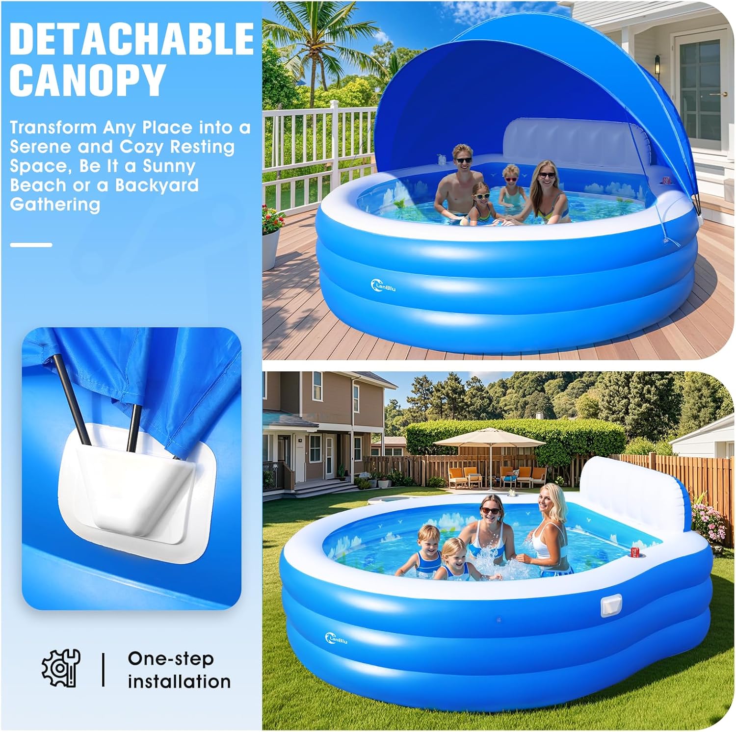 2025 Upgraded Inflatable Pool with Canopy, Inflatable Family Lounge Pool, Round Blow Up Pool for Adult with Bench & Backrest, Swim Center Easy Backyard Pools for Kids & Adults, 92"x92"x26", Blue