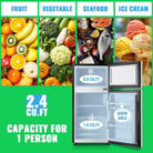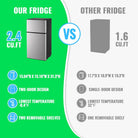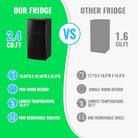 - Tiny Size with Suitable Storage: 15 x 14.6 x 30.8 inches, the black fridge fits perfectly into any mini space; 2.4 Cu.Ft suitable capacity with a freezer capacity of 0.8 Cu.Ft on top and a refrigerator space of 1.6 Cu.Ft below