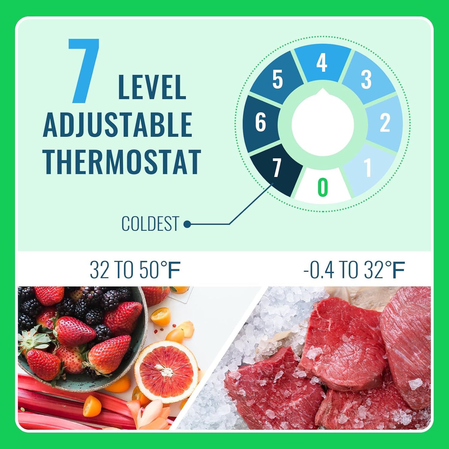 - Adjustable Temperature Knob: This so mini fridge has seven temperature settings with exceptional cooling capability; The freezer maintains temp ranging from -0.4 °F to 32 °F, while the refrigerator maintains keeps temp between 32 °F to 50 °F