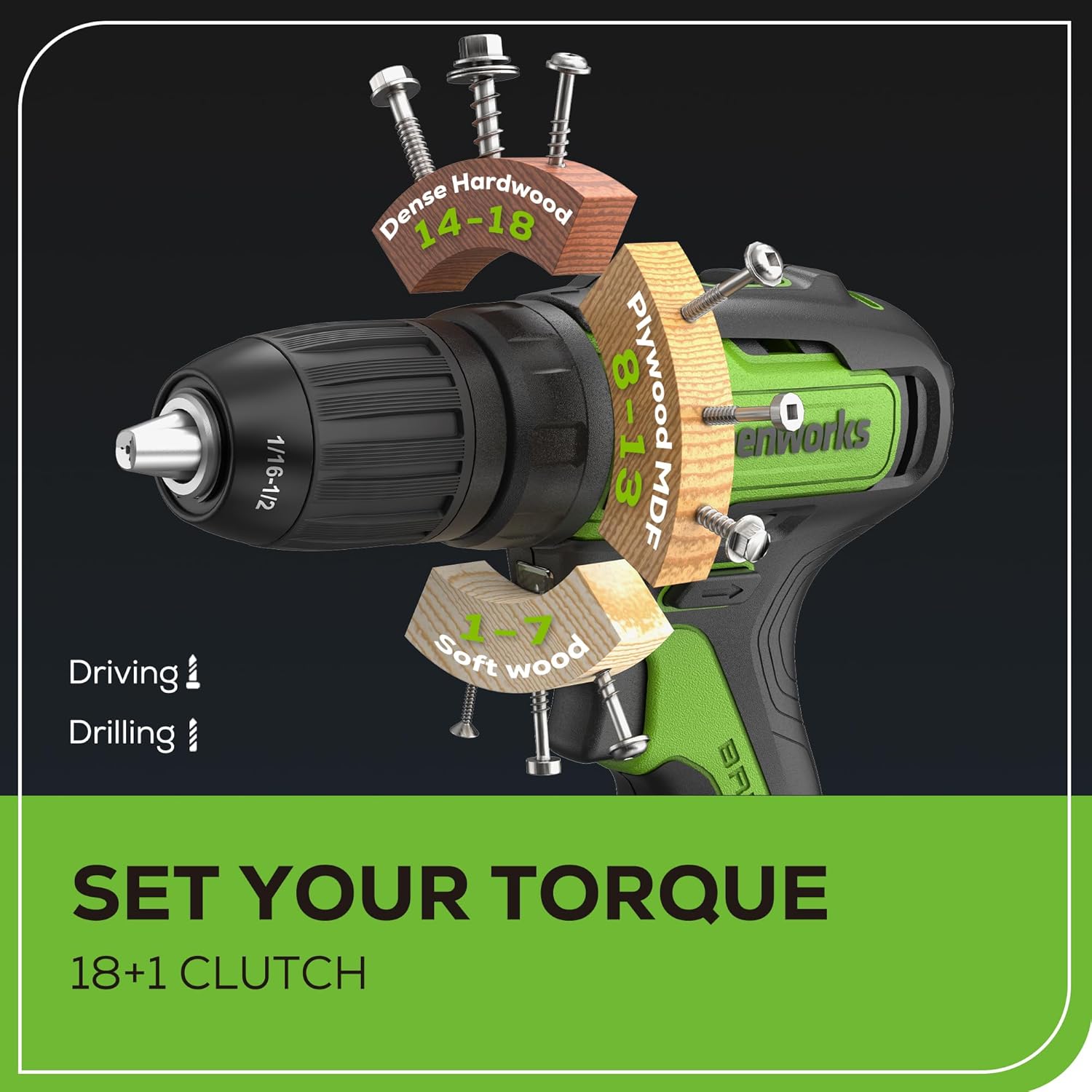 • Drill set features 2 speed transmission (0-380RPM/0-1450RPM), 310 in-lbs (35Nm) torque, 18 + 1 position clutch with 1/2 in. Keyless chuck offers precise speed control and torque adjustment when drilling holes and driving screws on different surfaces.