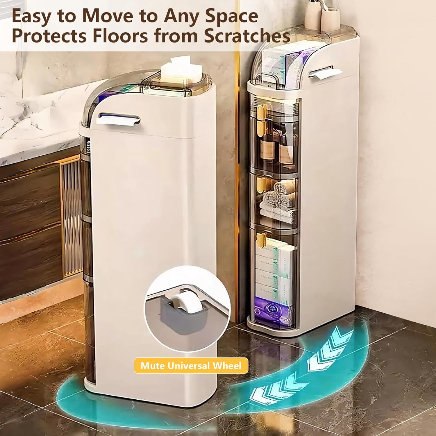 4-Tiers Narrow Bathroom Storage Cabinet 7.1″ Slim Bathroom Floor Organizer with Drawers and Tissue Box Plastic Waterproof Mobile Locker