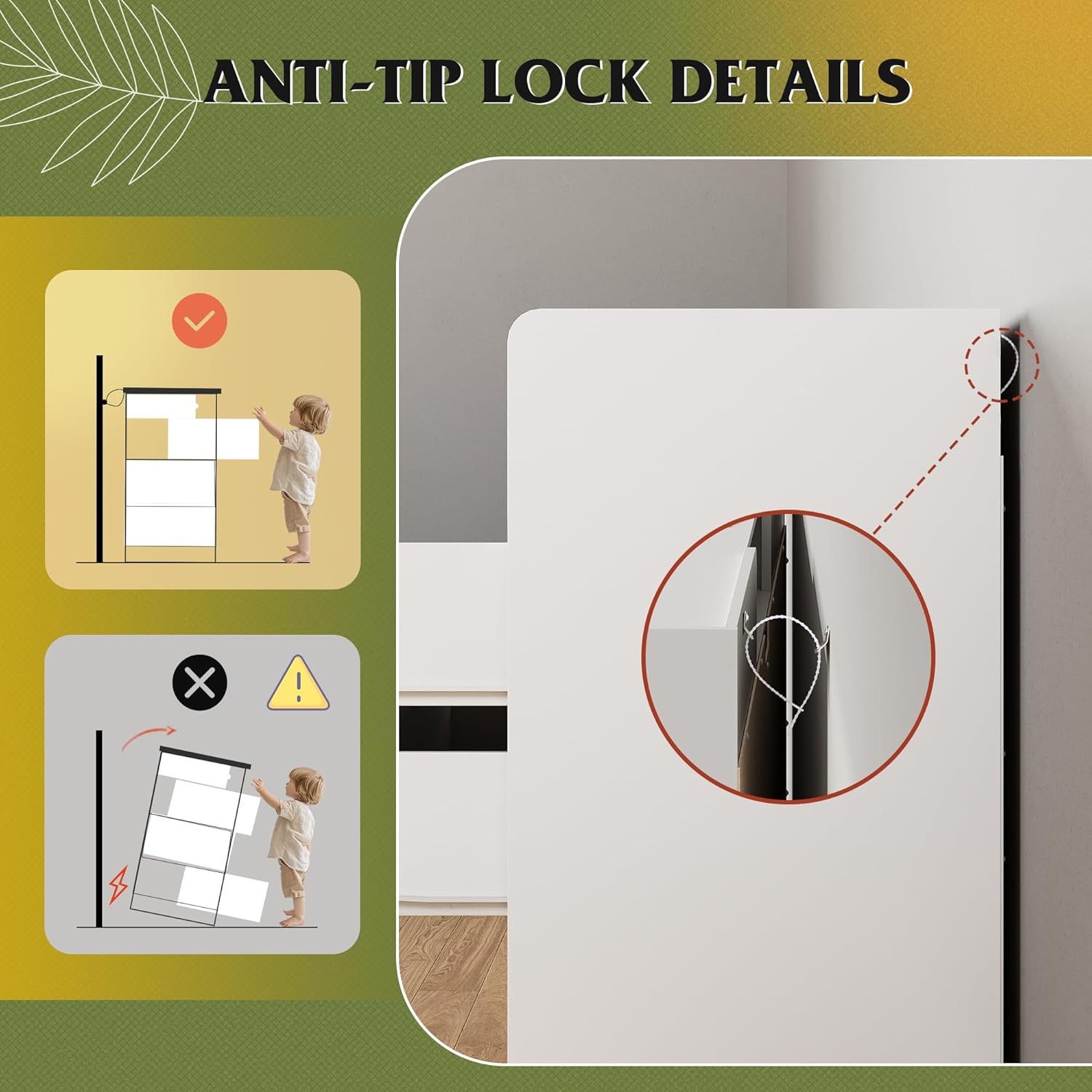 - 【✨ Stable Structure Safety Assured】This bedroom dresser is designed with reinforced base at the bottom. The entire cabinet bearing up to 228LBS can still remain stable without tipping. Additional anti-tilt device can easily fix the cabinet to the wall, ensuring the safety of you, your family and pets, and enjoying a convenient life!