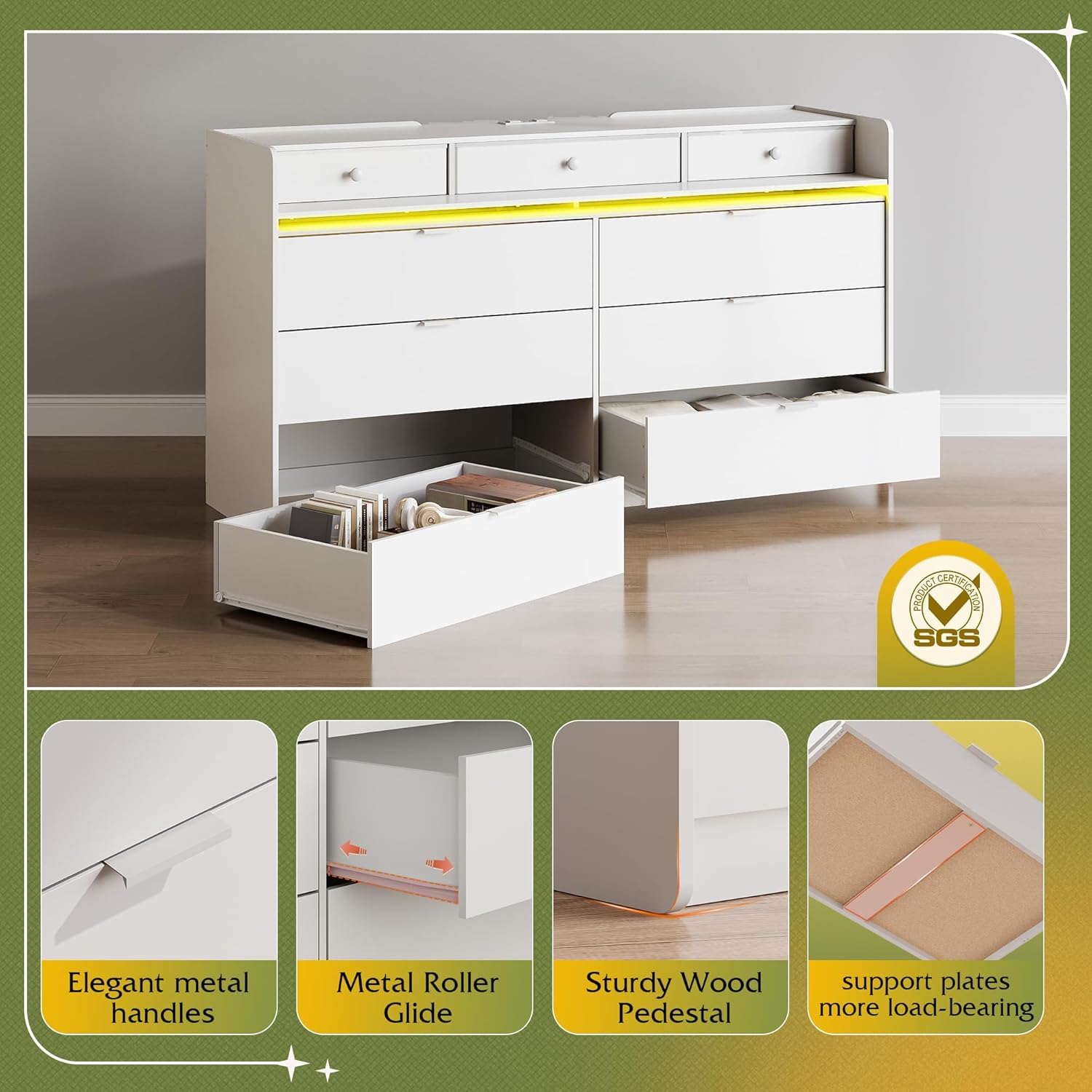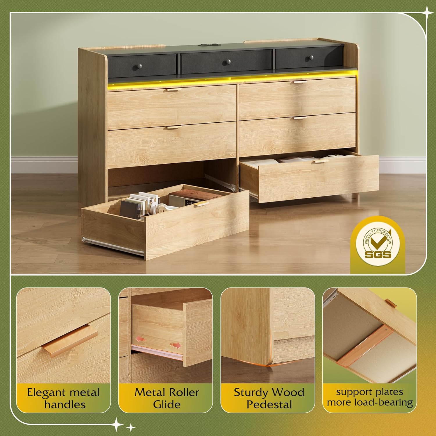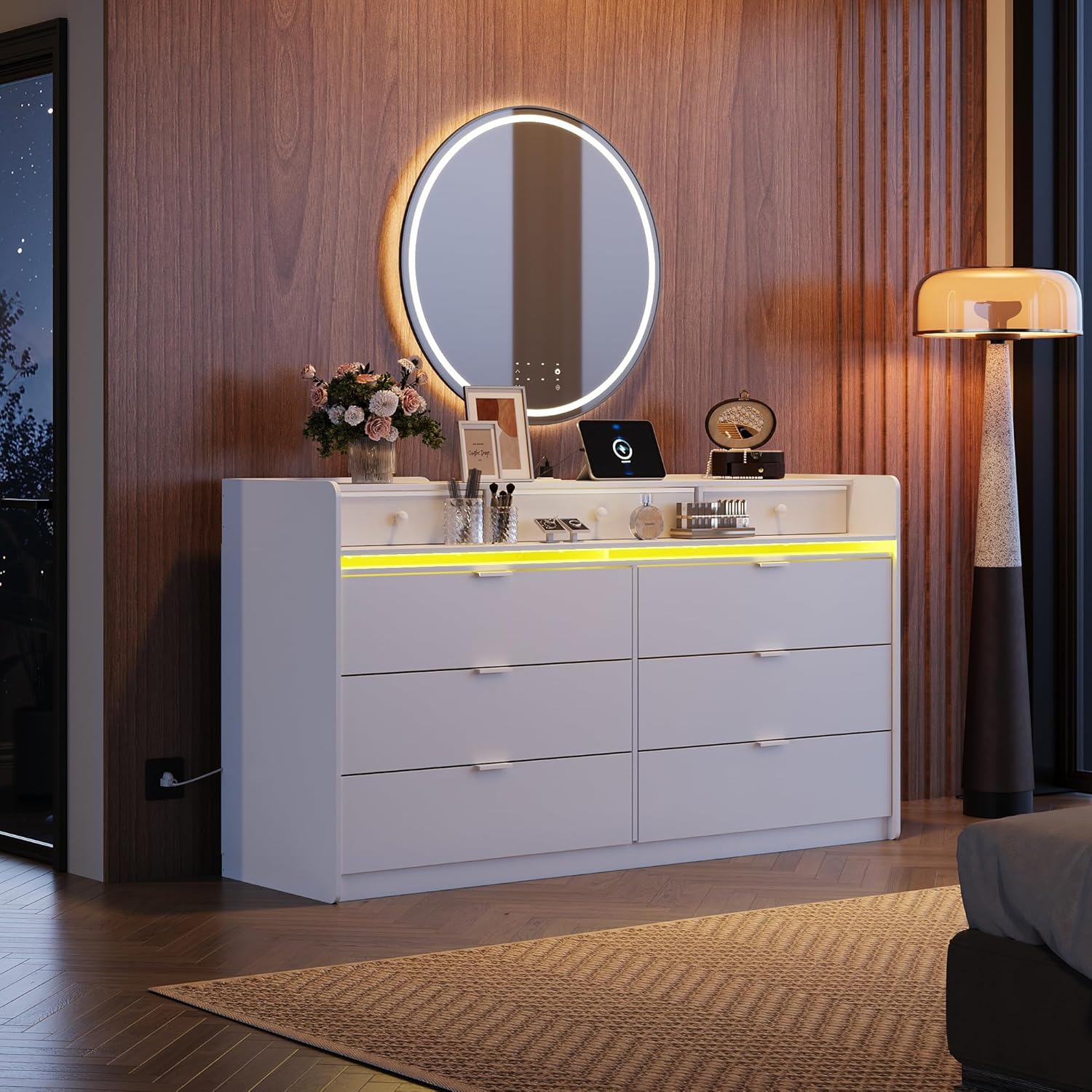 - 【🏠Multifunctional dressers & chests of drawers】Comes with LED light, through the remote control or APP to easily control 12 scene modes and 6000 colors, speed and brightness can be adjusted. It flexibly adapts to various scenes such as bedroom, living room, esports room, and the lighting can be synchronized with music to provide a personalized atmosphere for movie nights, games, and family gatherings!