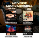 Over 40GB of all new, multi-layered factory content and instruments on 128 GB of internal storage. Featuring automatic crosstalk filtering with presets for all modern Alesis electronic triggers.