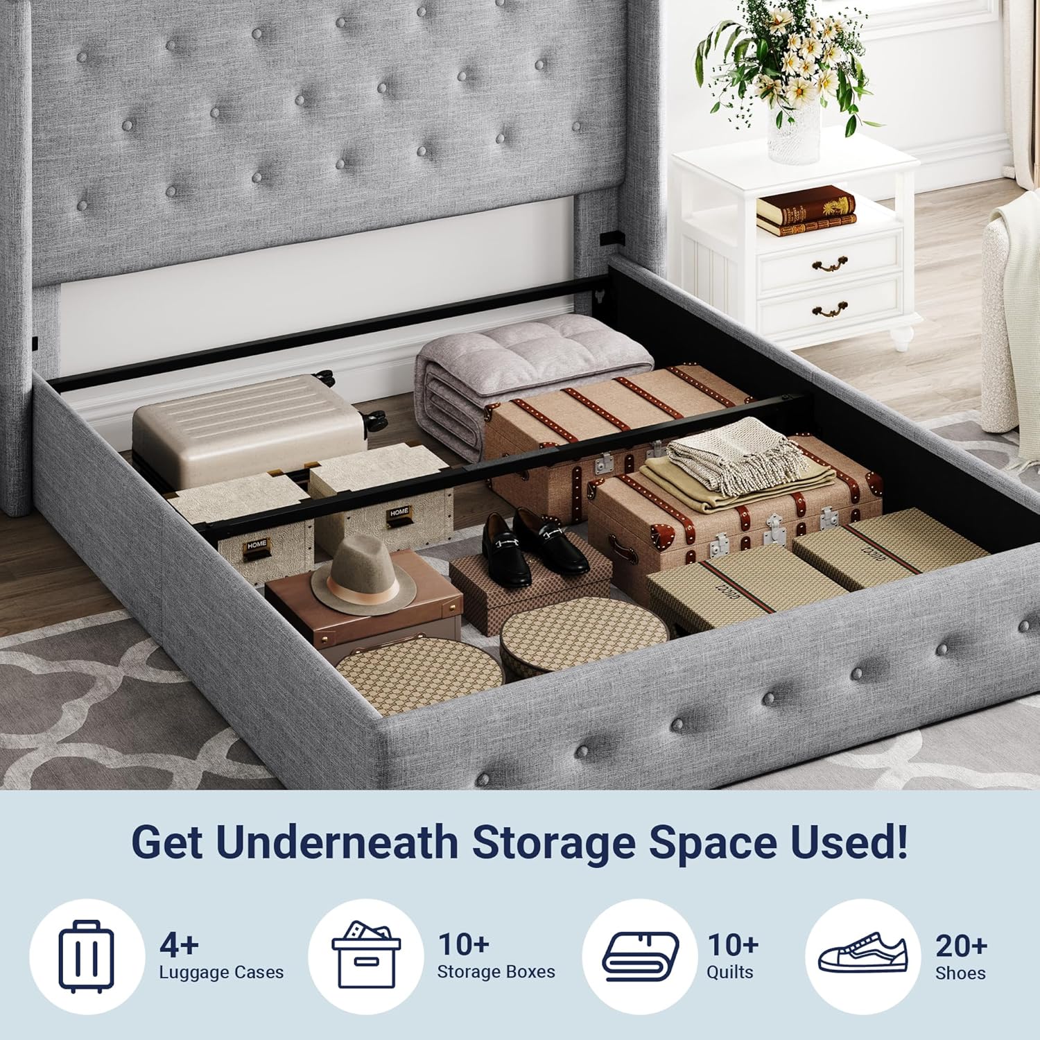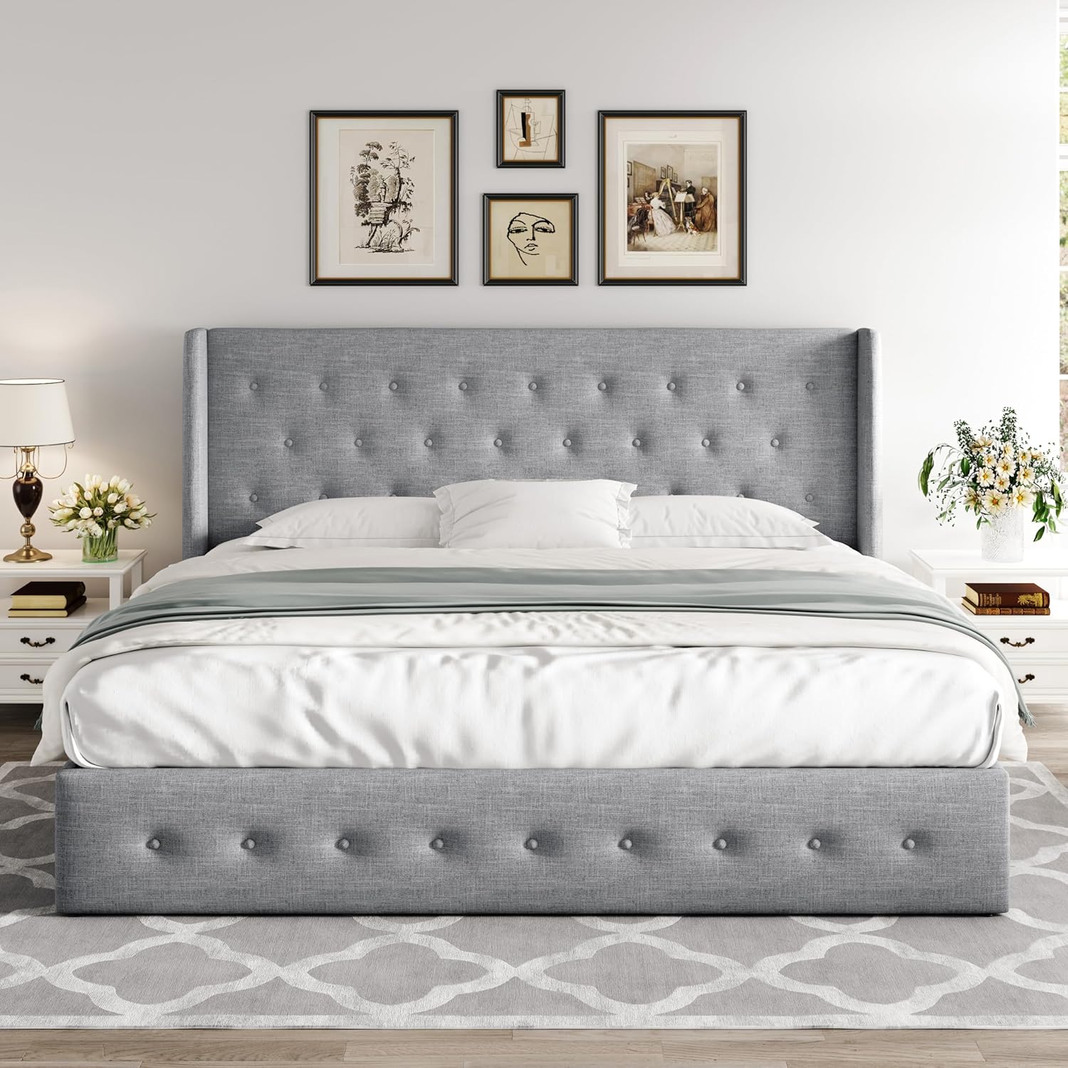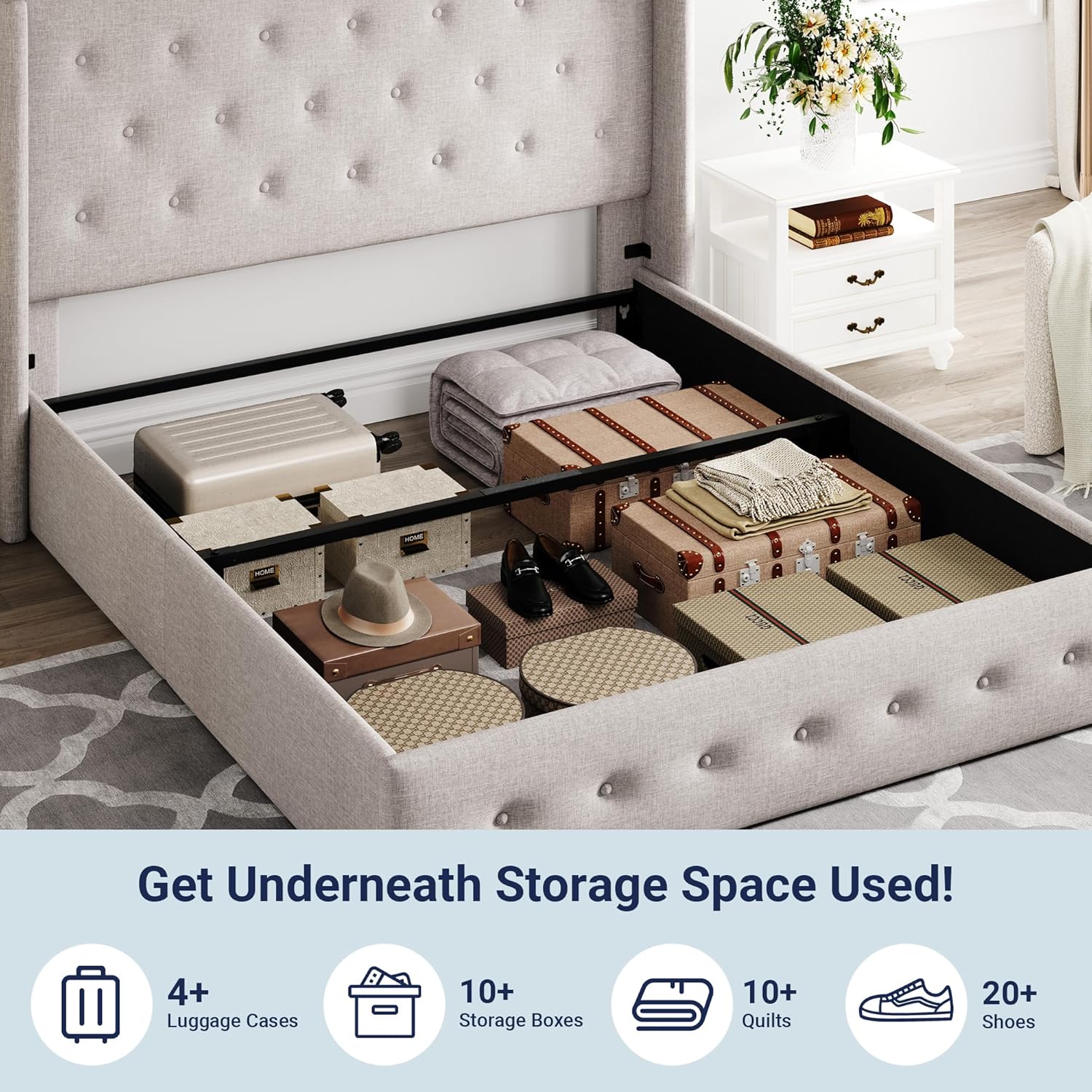 Allewie Queen Size Lift Up Storage Bed, Modern Wingback Headboard, Hydraulic Support, No Box Spring Needed, Light Beige