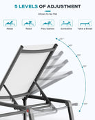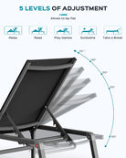 • 【5-LEVEL ADJUSTABLE BACKREST】 This chaise lounge offers 5 position backrest, allowing you to freely switch between sitting and lying down. It can effectively reduce the fatigue of long-term sitting and protect your waist, thereby reducing body fatigue