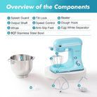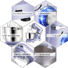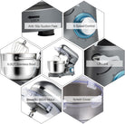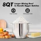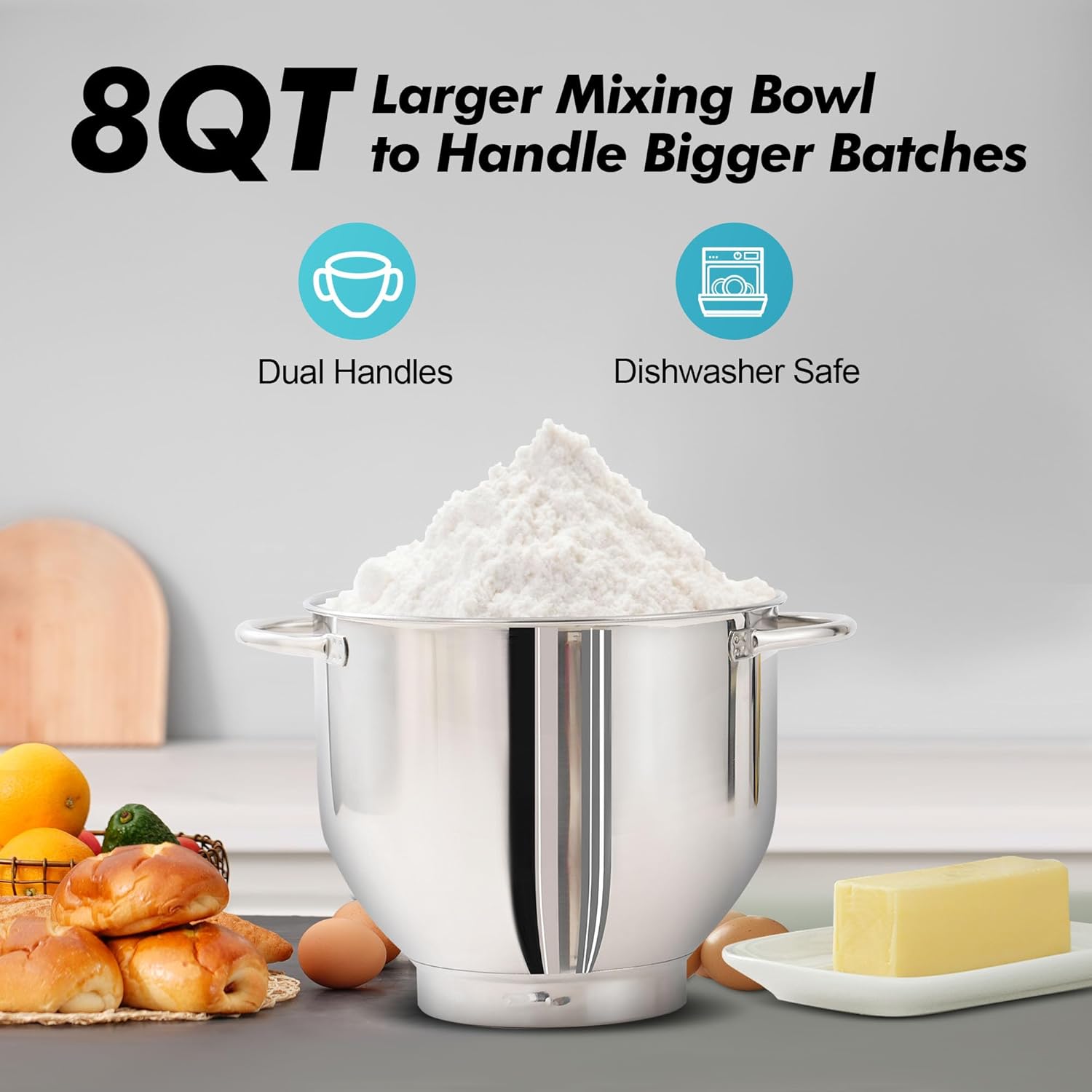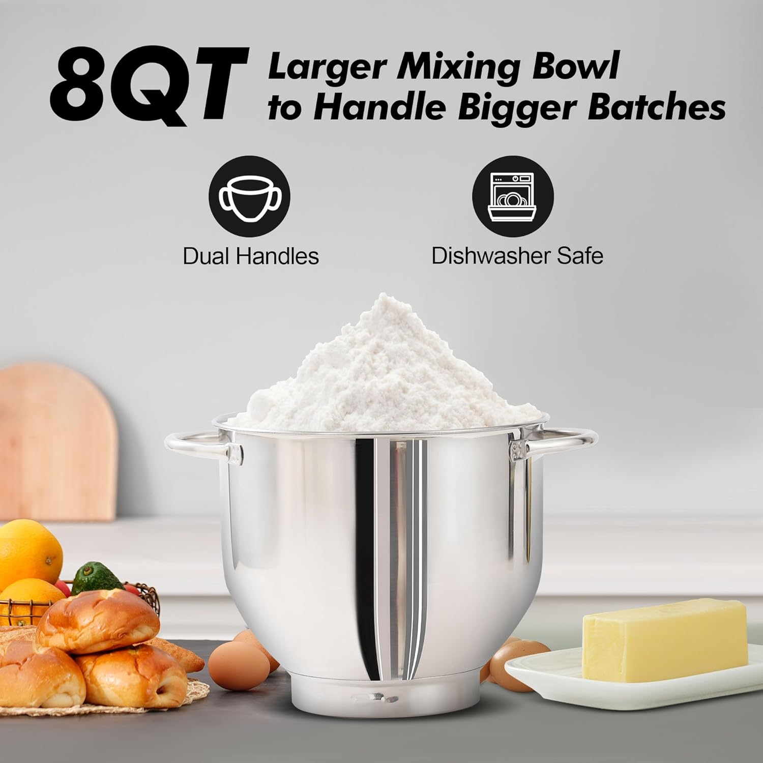 - 6.5Qt Large Capacity Bowl With Handles - 6.5QT Stainless steel bowl can meet all your kitchen needs. The Stand Mixer is easy to use for making cakes, breads, cookies, pastry, muffins and waffle, and the dual handles are more convenient to hold.