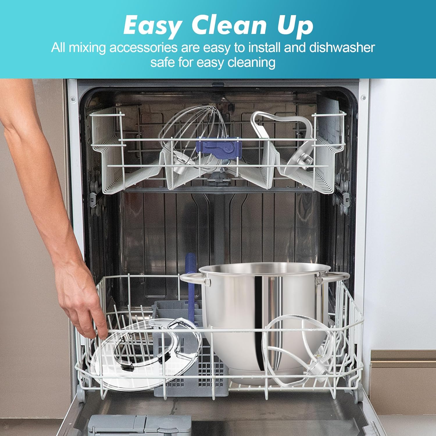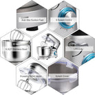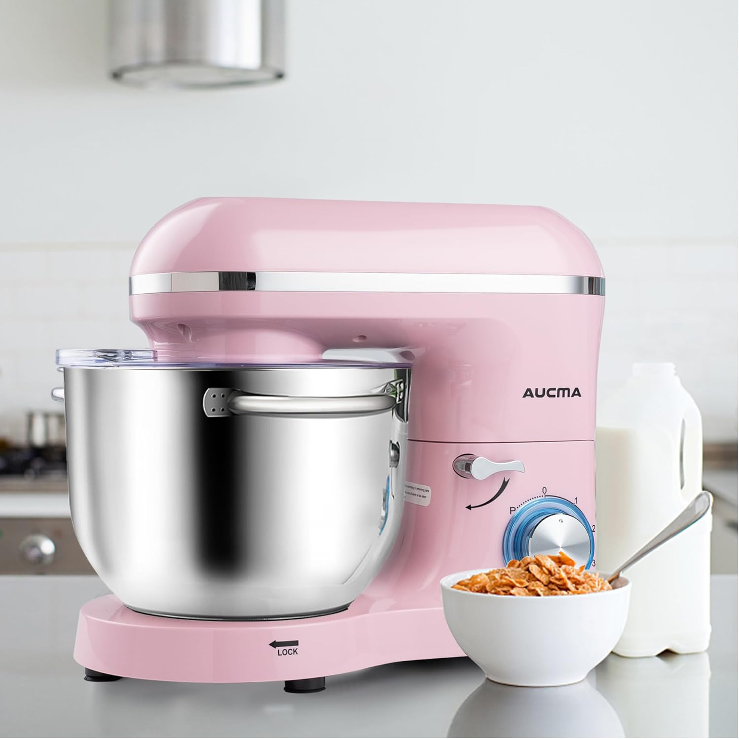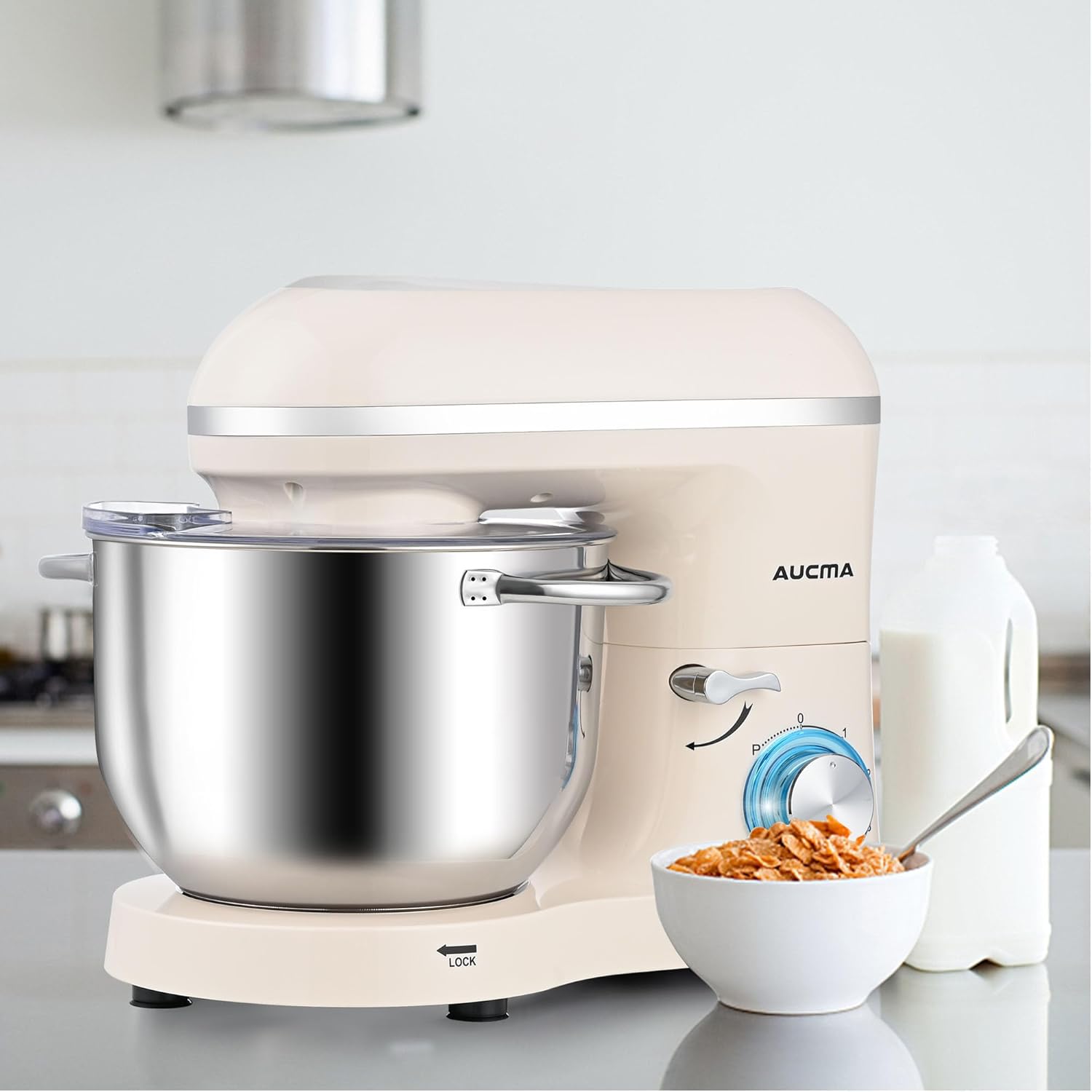 - Multiple Attachment Set - Aucma stand mixer comes with three mixing accessories: whisk, dough hook, mixing beater.The splash guard with access hatch helps add ingredients without making a mess.