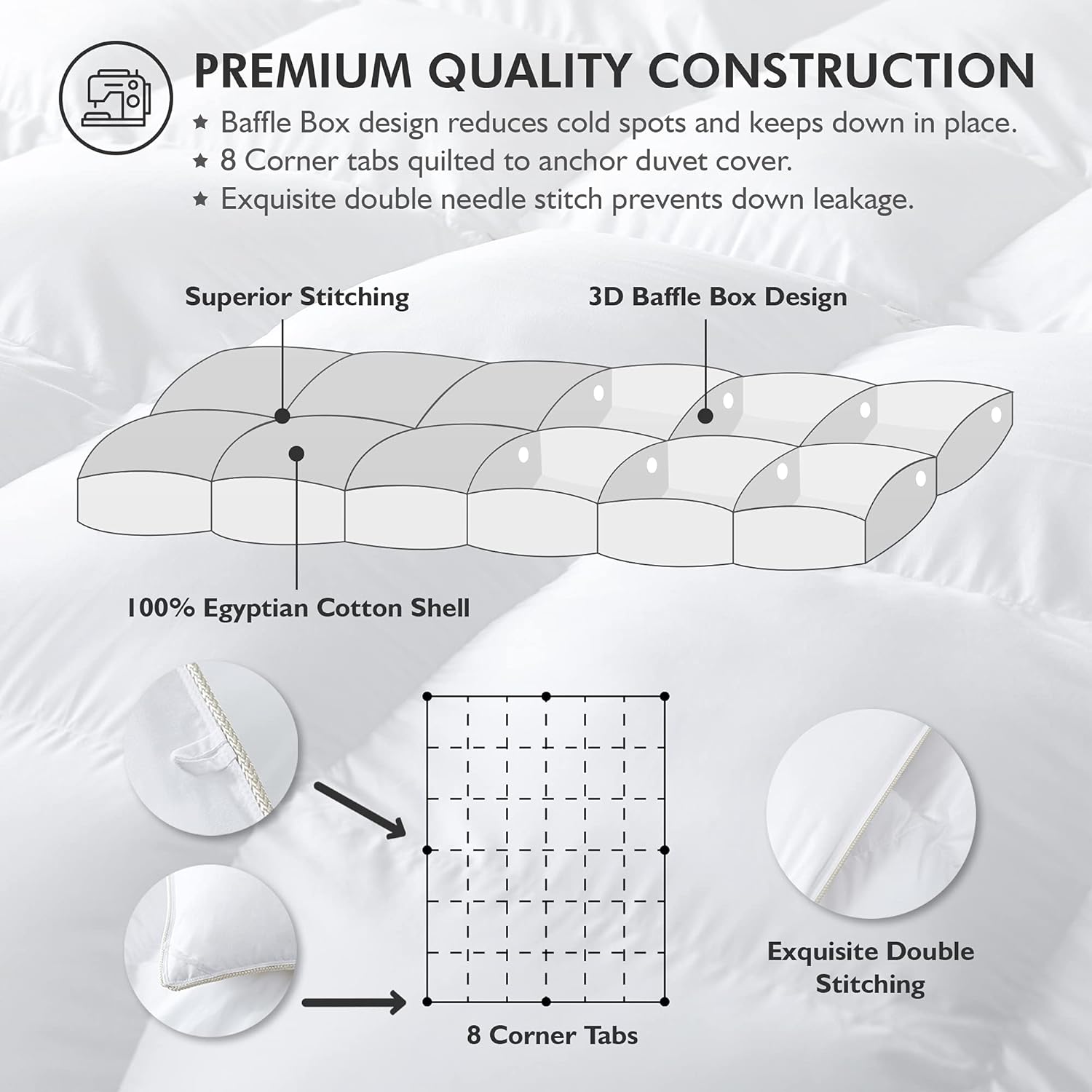 8 Corner tabs to easily secure your duvet cover to this comforter and protect comforter from shifting. Double needle stitch prevent leakage. Elegant stitching and exceptional workmanship make this 5-star hotel bedding.