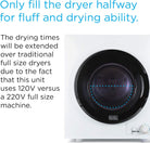 Only fill the dryer halfway for fluff and drying ability. The drying times (20 - 200 minutes) will be extended over traditional full-size dryers since this unit uses 120V versus a 220V full size machine.