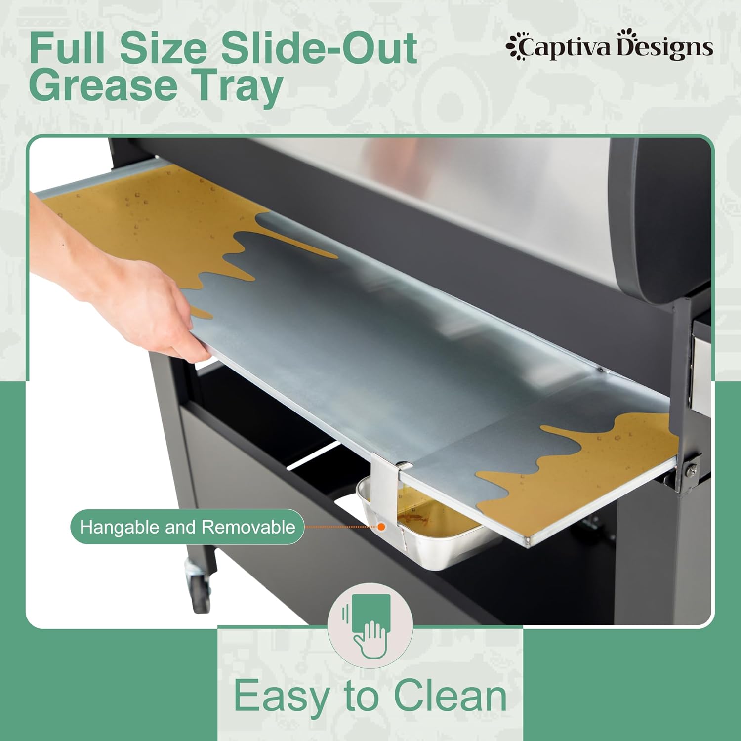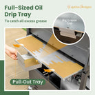 - 𝐄𝐚𝐬𝐲 𝐭𝐨 𝐂𝐥𝐞𝐚𝐧: The fullsize pullout oil drip tray design allows the grease and residue collected effectively during the cooking, keeping the grill clean. Moreover, the pullout design makes the cleaning process easy and quick. Just pull the tray out gently, pour out the grease, clean and put it back in place. Not only convenient and practical, but also ensures the longterm use effect and maintenance of the appearance of the barbecue grill