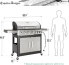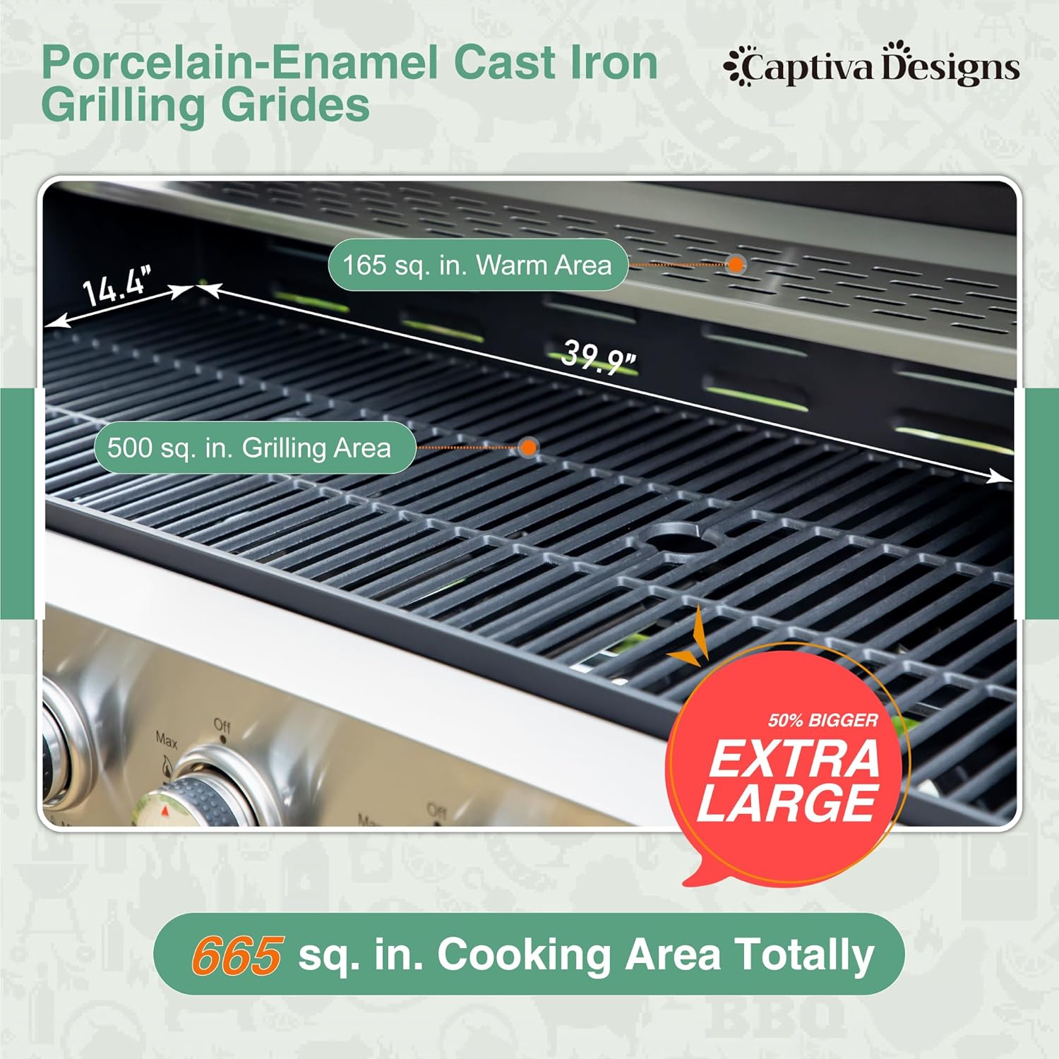 - 𝐏𝐨𝐫𝐜𝐞𝐥𝐚𝐢𝐧-𝐄𝐧𝐚𝐦𝐞𝐥𝐞𝐝 𝐂𝐚𝐬𝐭 𝐈𝐫𝐨𝐧 𝐆𝐫𝐢𝐥𝐥 𝐆𝐫𝐚𝐭𝐞𝐬: We have upgraded the main cooking area grates to porcelainenameled cast iron, which combines the advantages of traditional cast iron and enamel grates. These grates are heavyduty, nonstick, rustresistant, and crackresistant. They provide more even heat distribution when used with the four stainless steel burners and enameled flame tamers