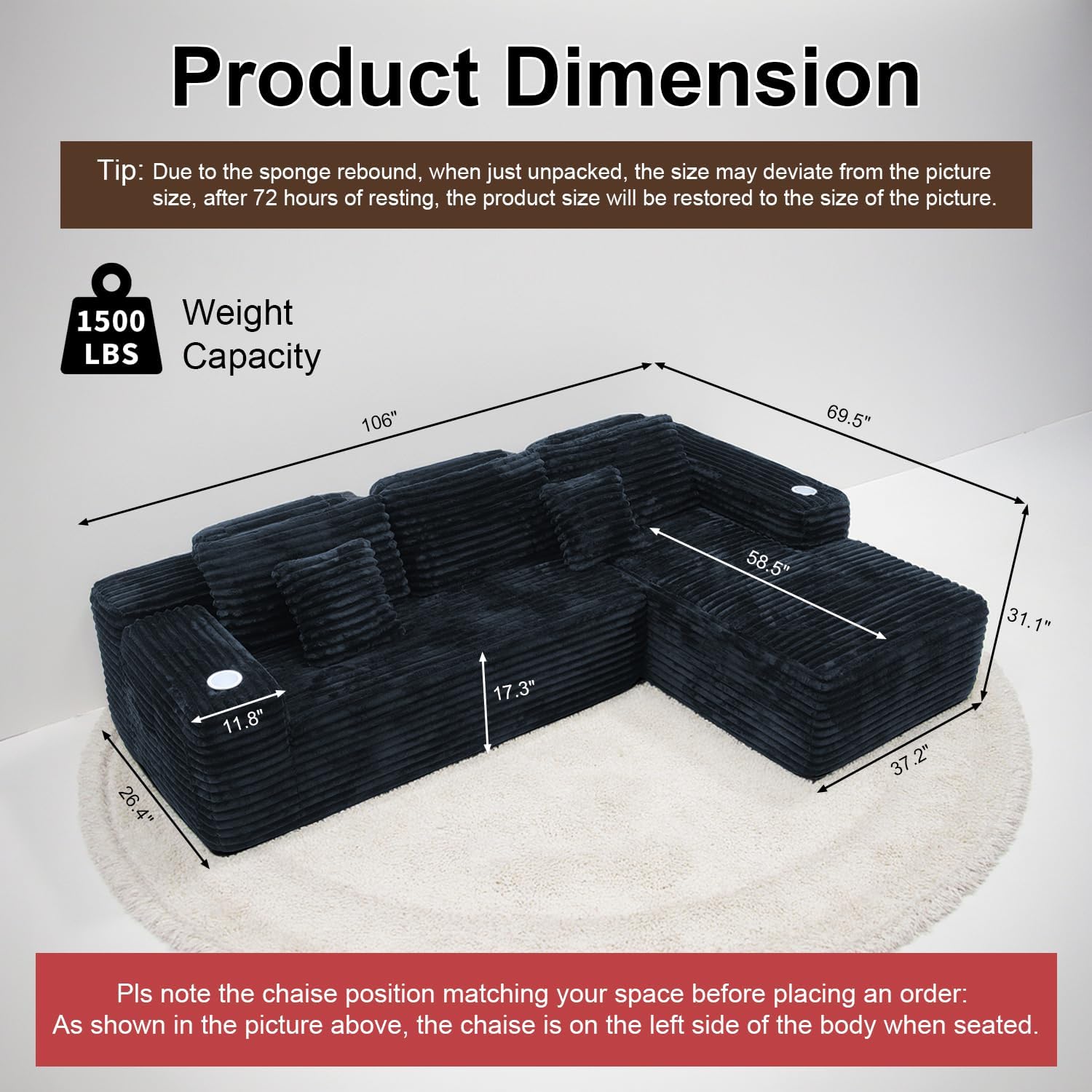 - 🚩🚩【As shown in the first image】When you're sitting on the couch, if the chaise (the extended lounging part) is on your right side, it's a right-arm chaise sofa; If it's on your left side, it's a left-arm chaise sofa. Note:Remember to install the twin cup holders after the sofa fully expands. Before installing, peel off the black protective plastic from the aluminum alloy holders.