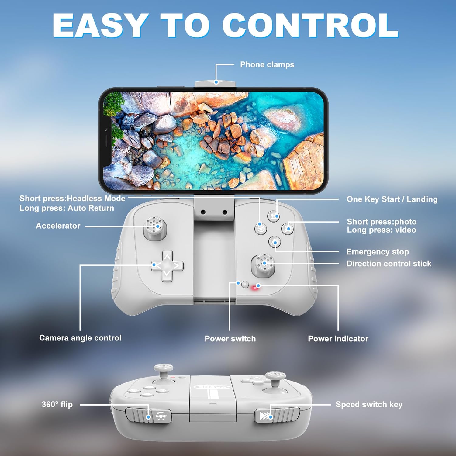 - 【Real-time Image Transmission and HD Photography】This small drone is equipped with an HD camera to capture stunning photos and videos with high quality and frame rate. The camera angle can be adjusted remotely up to 90 degrees. Combined with the upgraded hover system and optical flow positioning technology, the camera drone is more stable when shooting. Wi-Fi real-time transmission enables quick sharing of happy moments with family and friends
