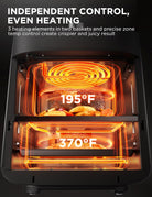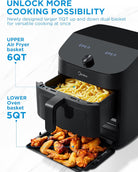 • INNOVATIVE DOUBLE-DECKERS DESIGN: This dual air fryer features both an upper 6QT basket and a lower 5QT baking pan, providing 11QT large capacity but taking up smaller footprint with its exclusive design. Basket for fries, nugget, and pan for pizza, bread. lt is all up to you!