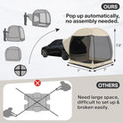 - EASY POP UP & TAKE DOWN: Trunk tent suv car tent pop up automatically, set up and attached with vehicle in a second, much easier than the other assembly car tents in the market. It measures 7’x7’x7.2’H, large interior space fits 4 - 5 adults comfortably. The innovative folding technique allow you to easily fold down it into a carry bag, dia 51.2”, only 16.6 lbs, lightweight and portable.