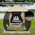 - INNOVATIVE STYLE: 3 mesh wall panels provide excellent air flow and amazing outdoor views. Connecting to the cargo area of vehicle, the bottom fabric of door wraps the car bumper. And the adjustable vehicle sleeve can be fixed with the van attached by magnets easily and closeness, so that you are protected from mosquitoes & insects. One large entrance door with double side zippers, easy to zip from inside and outside alike.