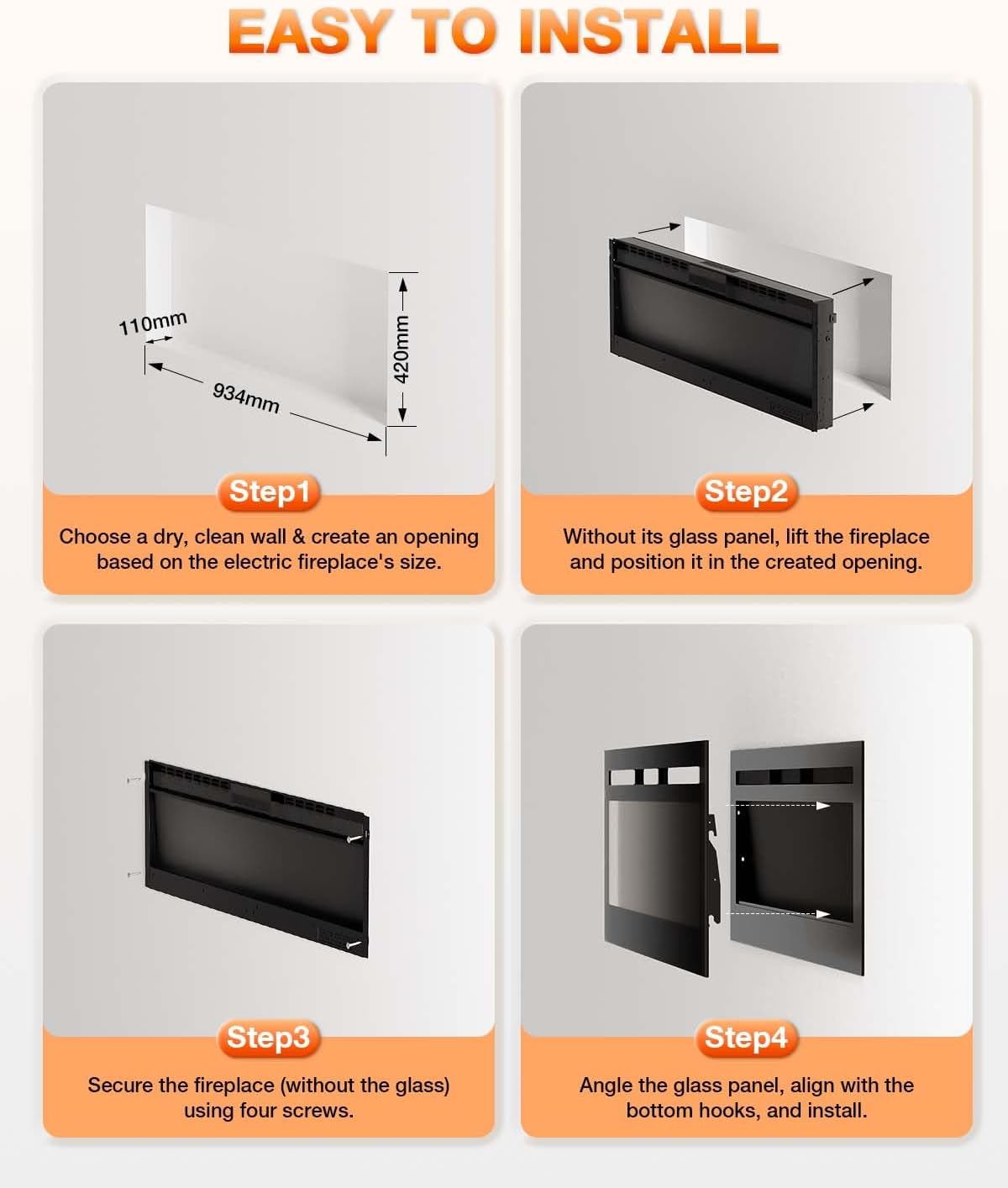 • Easy Installation: We offer various installation methods, including wall-mounted, built-in, and free-standing, to cater to different needs. The product comes with a clear instruction manual, and with simple steps, you can complete the entire installation within an hour.Then, sit back with your loved one and enjoy the lifelike flames