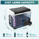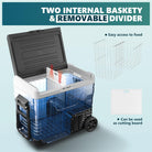 Two Zones & Mobile Design; The portable fridge features two storage zones to effectively reduce odors. With a 53Quart large capacity, two storage baskets, and a removable divider, the portable refrigerator is convenient to store and access all your food. The 12 volt refrigerator comes with dual handles and off-road wheels, making it portable and easy to move, lightening your load on the journey