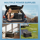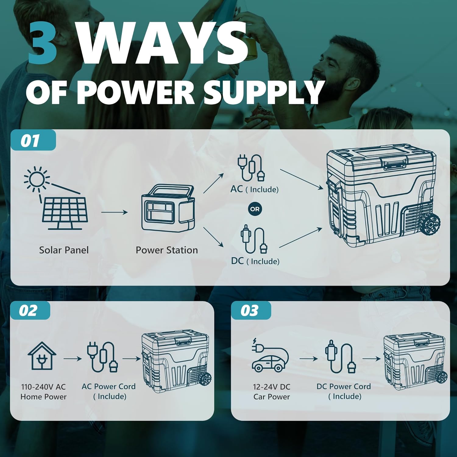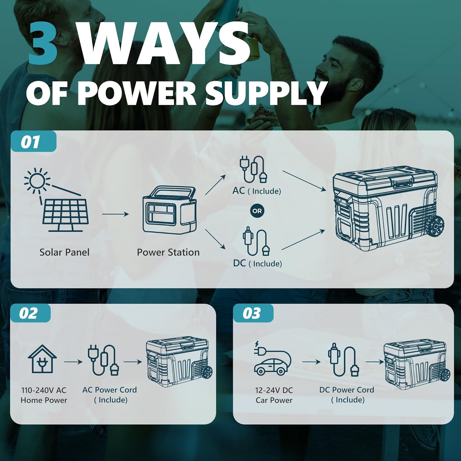 Battery Protection & Multiple Power Supplies; This portable electric cooler offers 3-level battery protection, allowing you to adjust the input power between L/M/H modes to prevent overload or vehicle battery drain. The portable fridge can be powered by both DC and AC, making it suitable for various scenarios