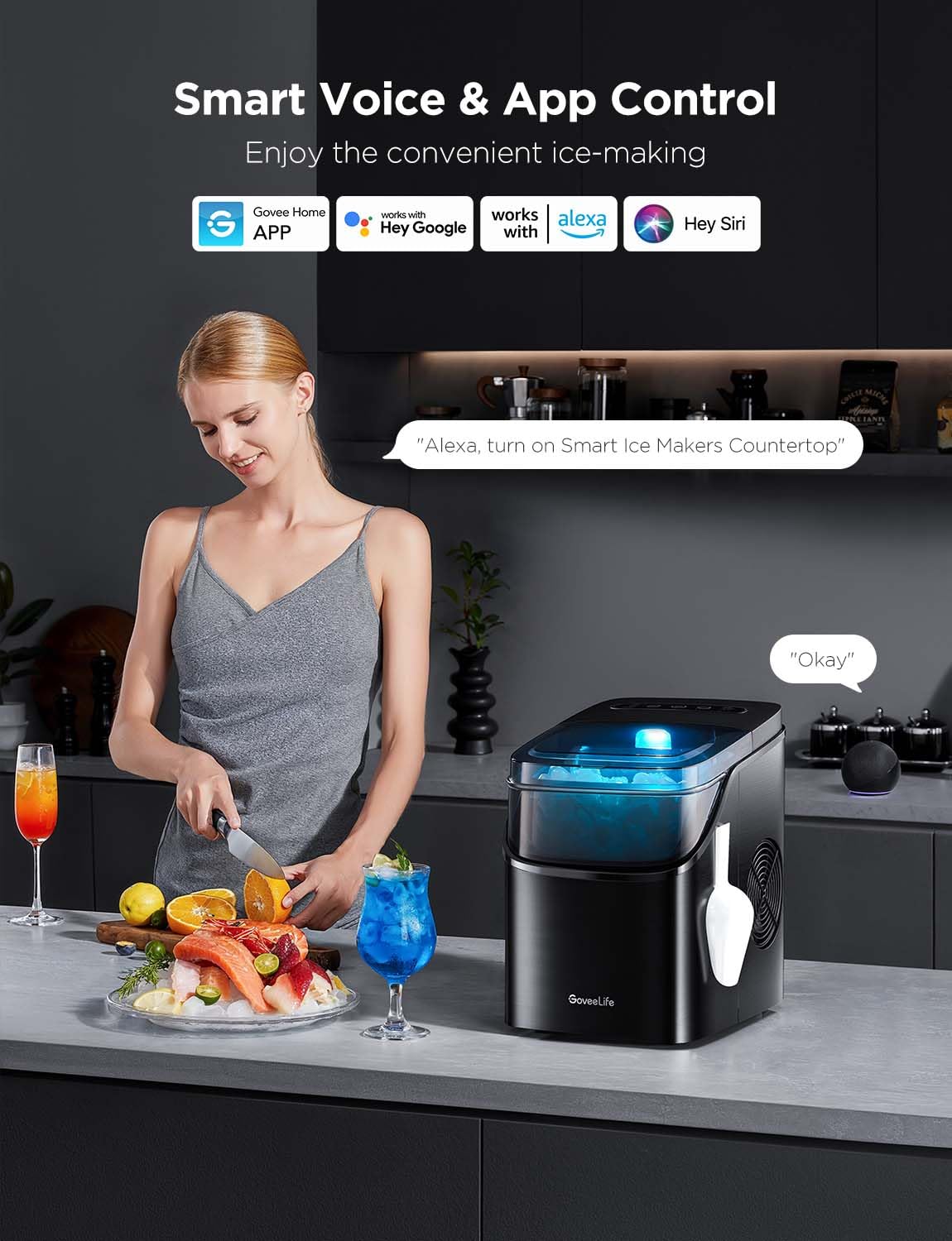 - Built-In Wi-Fi & Voice Control: Pair your ice maker with app. Use voice commands via Alexa and Google Assistant for a variety of smart functions. Monitor device status and schedule fresh ice anytime, anywhere. (Supports 2.4GHz Wi-Fi only).