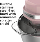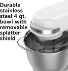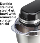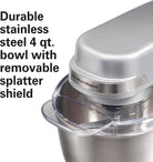 - DURABLE STAINLESS STEEL BOWL WITH REMOVABLE SPLATTER SHIELD: The stainless steel bowl is designed to withstand year after year of mixing and includes a removable splatter shield that fits on top when needed. Dishwasher safe for easy cleanup.