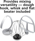 - PROVIDES MIXING VERSATILITY — DOUGH HOOK, WHISK AND FLAT BEATER INCLUDED: Three versatile attachments let you do everything from kneading pizza dough to mixing cookie dough and whipping cream.