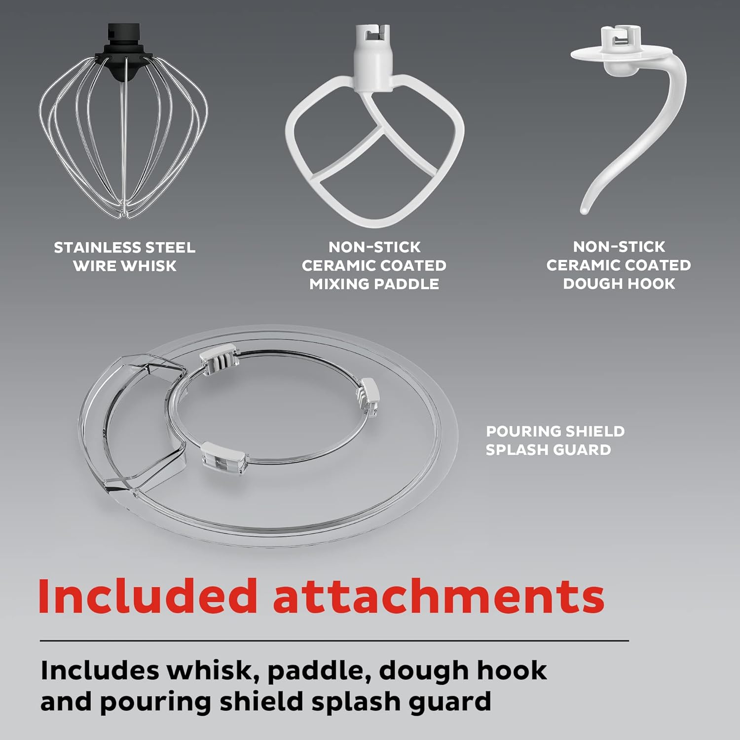 • INCLUDED ATTACHMENTS: It comes with (1) 6.3-qt stainless steel mixing bowl that can mix large batches of dough, (1) mixing paddle, (1) dough hook, (1) whisk, and a removable pouring shield.