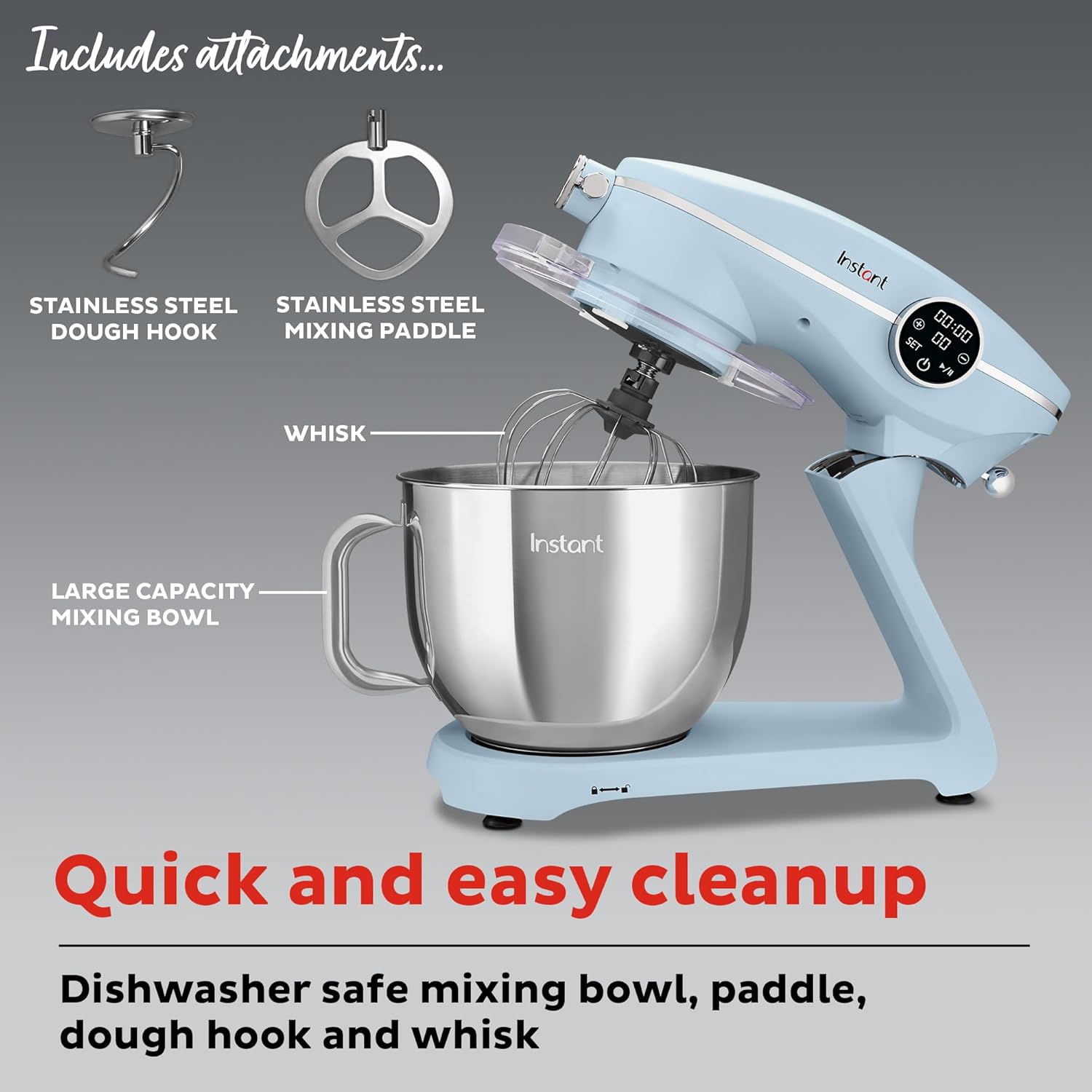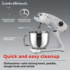 • Easy cleanup: dishwasher-safe stainless steel mixing bowl, paddle, dough hook and whisk