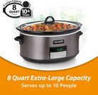 The 8-quart extra-large capacity is perfect for larger families and entertaining. Its generous size can also fit a 6-pound roast or 8-pound chicken.