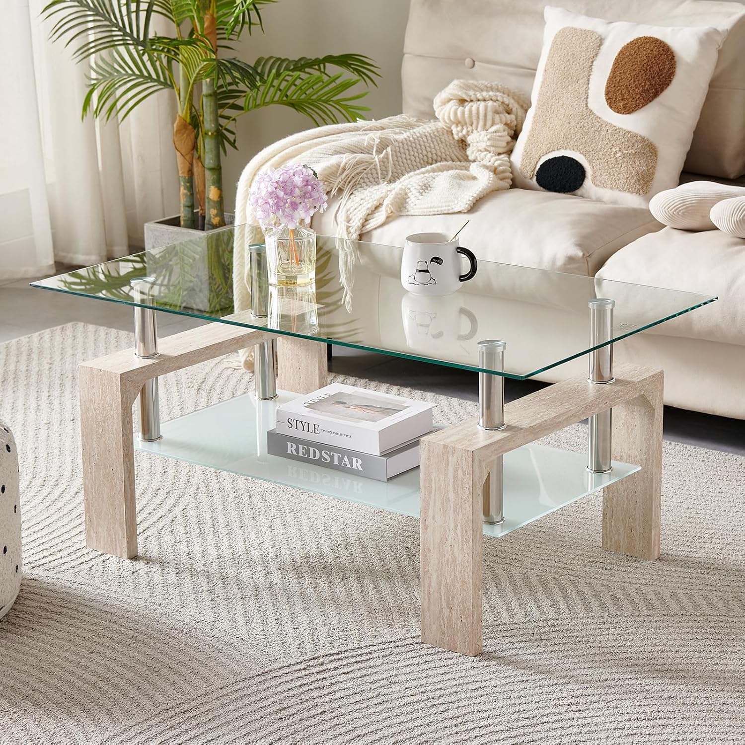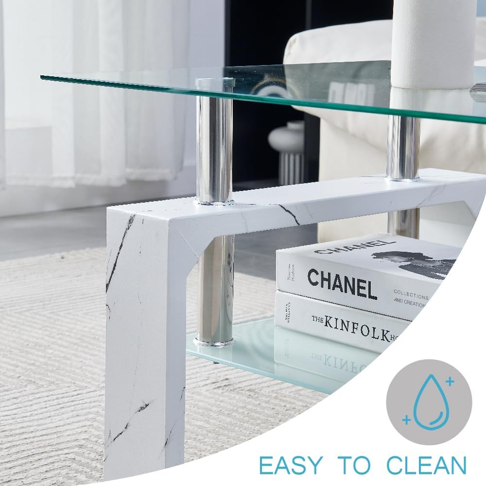 - 1.Stylish Design: This white marble coffee table with a two-tier tempered glass adds a modern touch to any living space, making it a perfect centerpiece for your home decor.