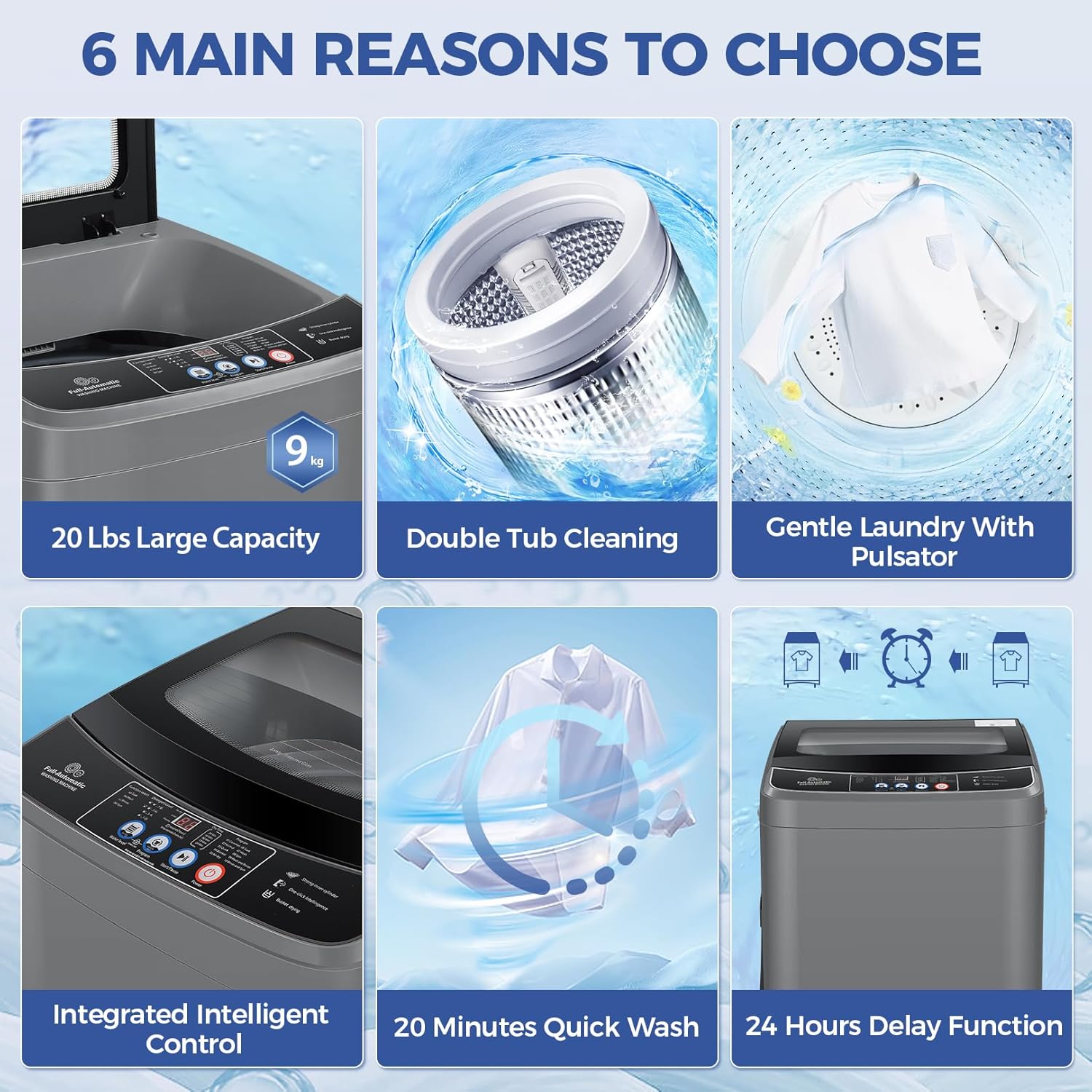 - [More Peace of Mind & Worry-free]--When you don't have free time to wait for your laundry, please use the 24-hour delayed start function of this portable washer, which can effectively help you to solve this problem. The safe child lock makes your family life more secure. The tub self-cleaning function makes your laundry environment healthier. The honeycomb-shaped stainless steel inner tank and fluff stain filter can effectively remove stains and hair on clothes, and reduce clothes wear.