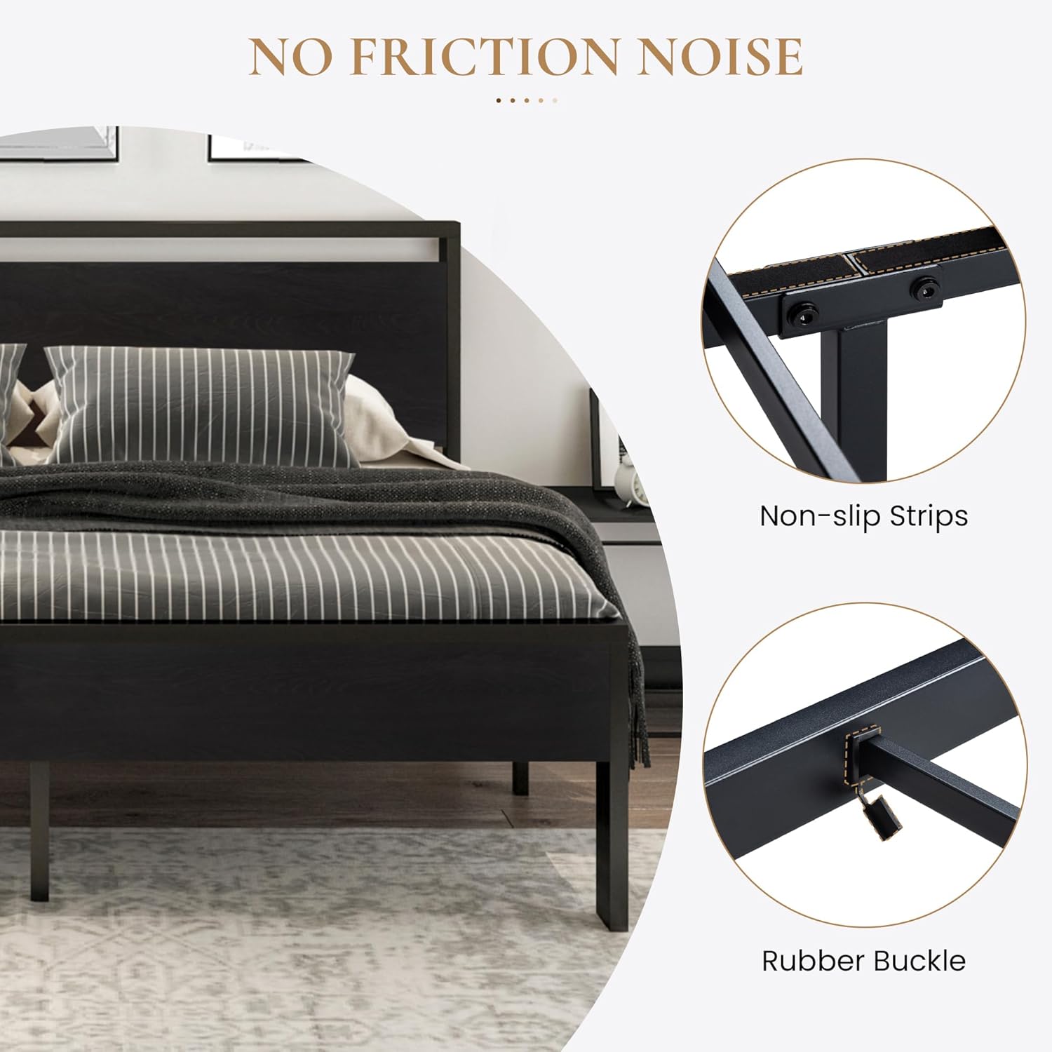 • Noise Free: The non-slip strips hold the slats in place, and plastic foot plugs added to the bottom of the bed feet will never scratch your beloved floor