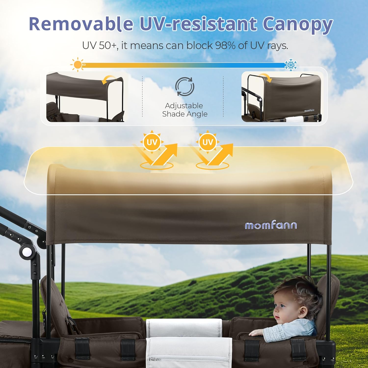 •  Your Adventure Buddy: Designed for ultimate flexibility, this durable double-seater wagon stroller lets you push or pull with ease. For navigating grasslands, parks, and campgrounds, it’s the ideal outdoor companion for two kids.