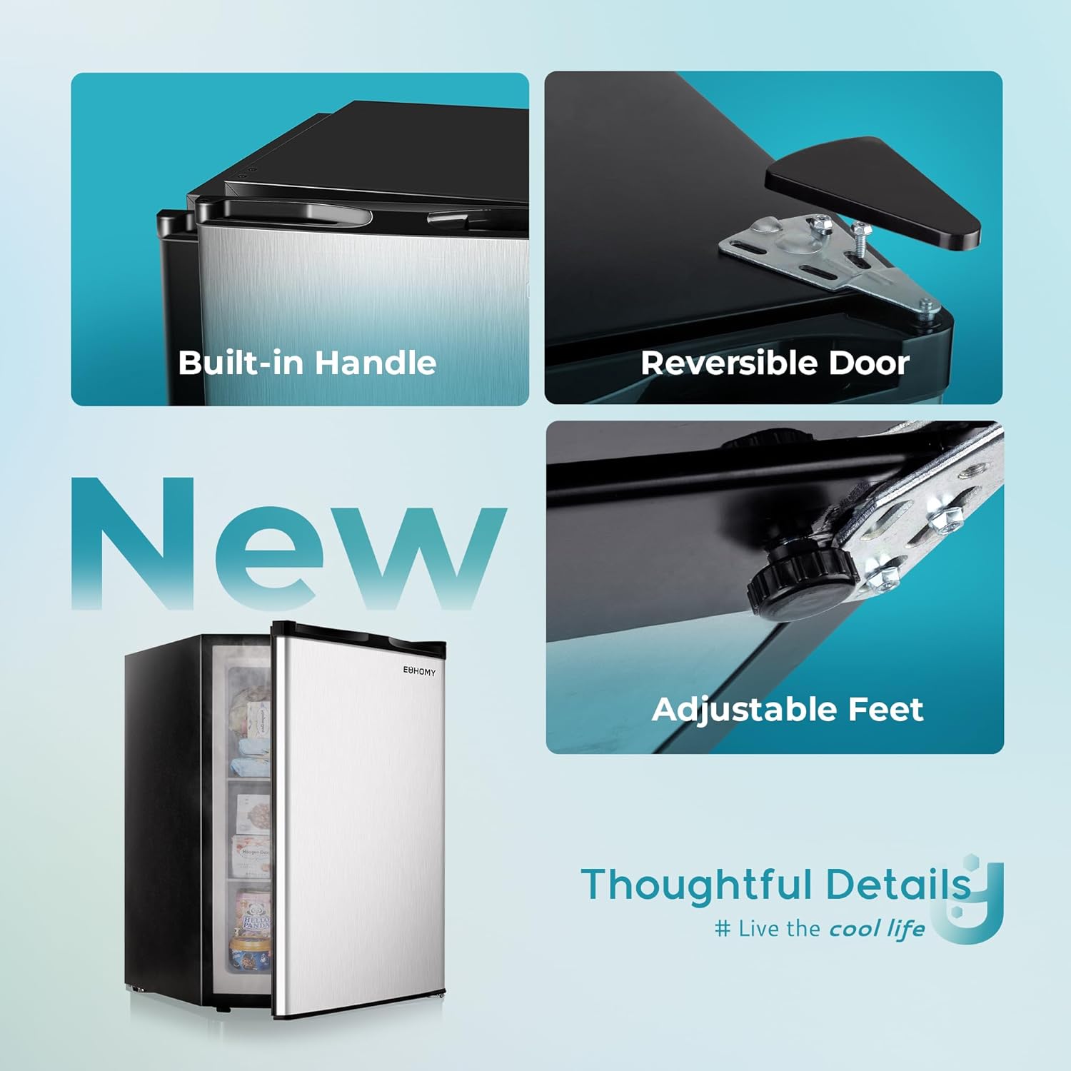 - DETAIL OPTIMIZATION - Euhomy freezer have designed some additional functions that are different from those on the market according to people's habits and needs. REVERSIBLE DOOR: It is easy to change the direction of the door switch. ADJUSTABLE FEET: keep the machine from being corroded by moisture on the ground. BUILT-IN HANDLE: not only easier to open the freezer door, ut also makes the freezer more simple and beautiful