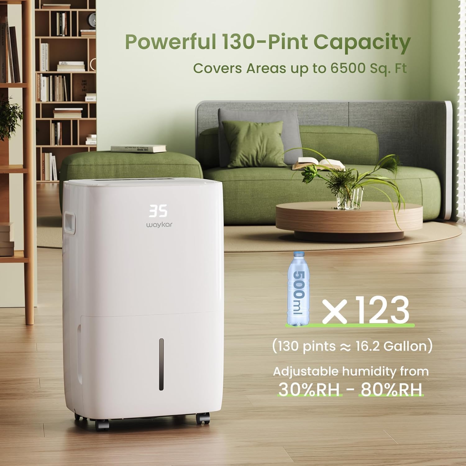 Waykar Home Dehumidifier, featuring a powerful compressor and 112 CFM system, is capable of removing moisture in spaces up to 2000 square feet. Whether you got a humid basement, office, home, bathroom, bedroom, kitchen, stockroom, living room, laundry room, cellars, crawlspace, etc., this dehumidifier can handle it all, improves air quality and promotes a comfort environment by keeping your place in the ideal 45%-55% humidity.