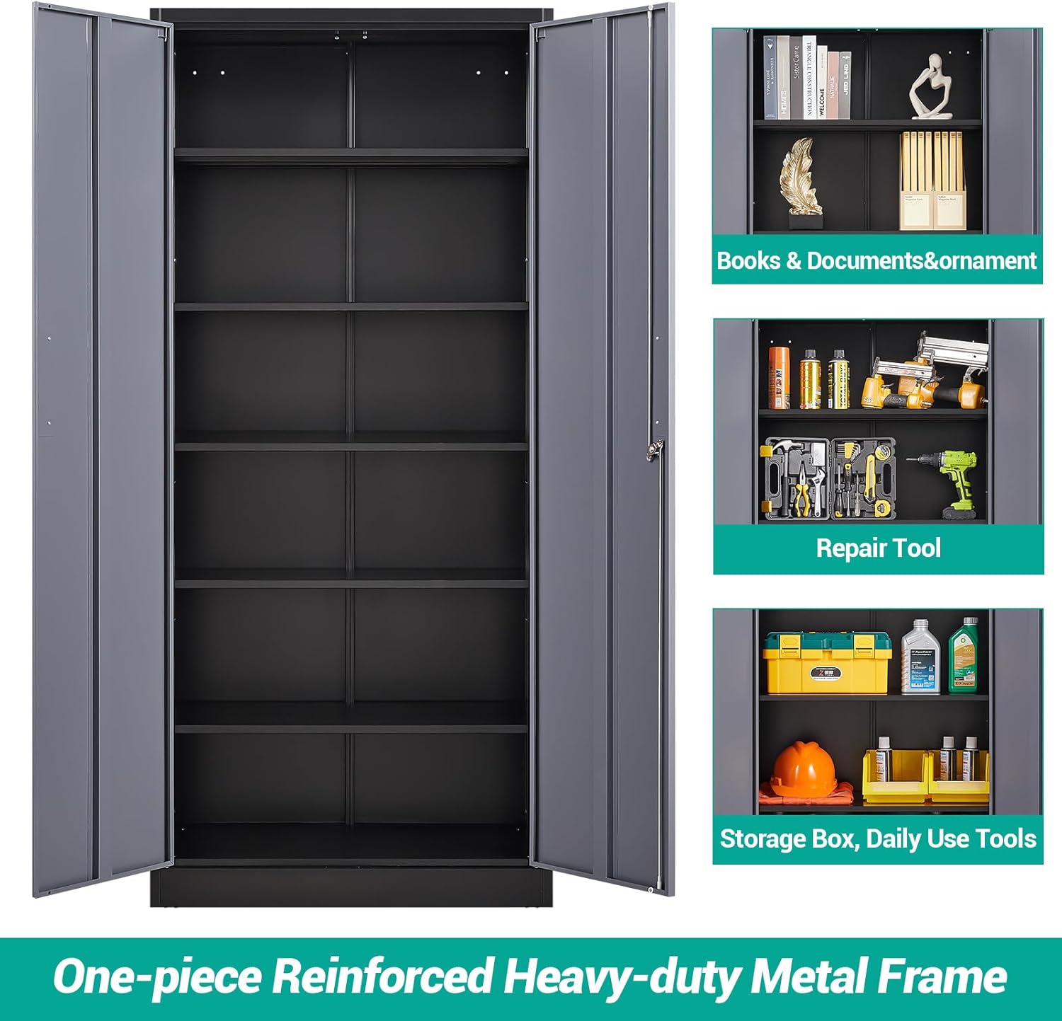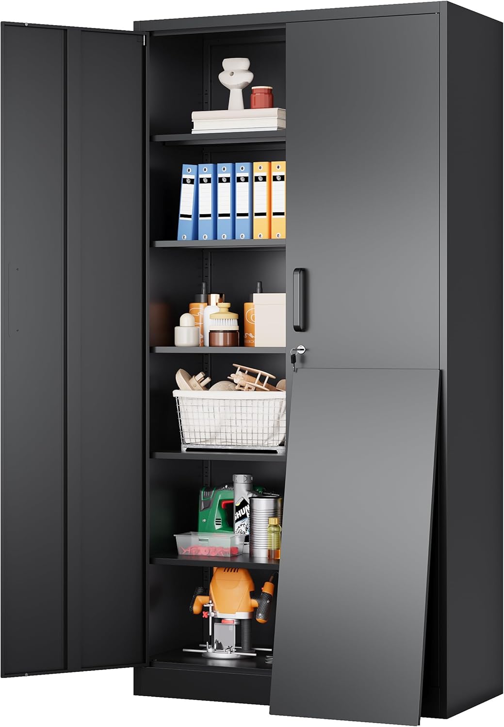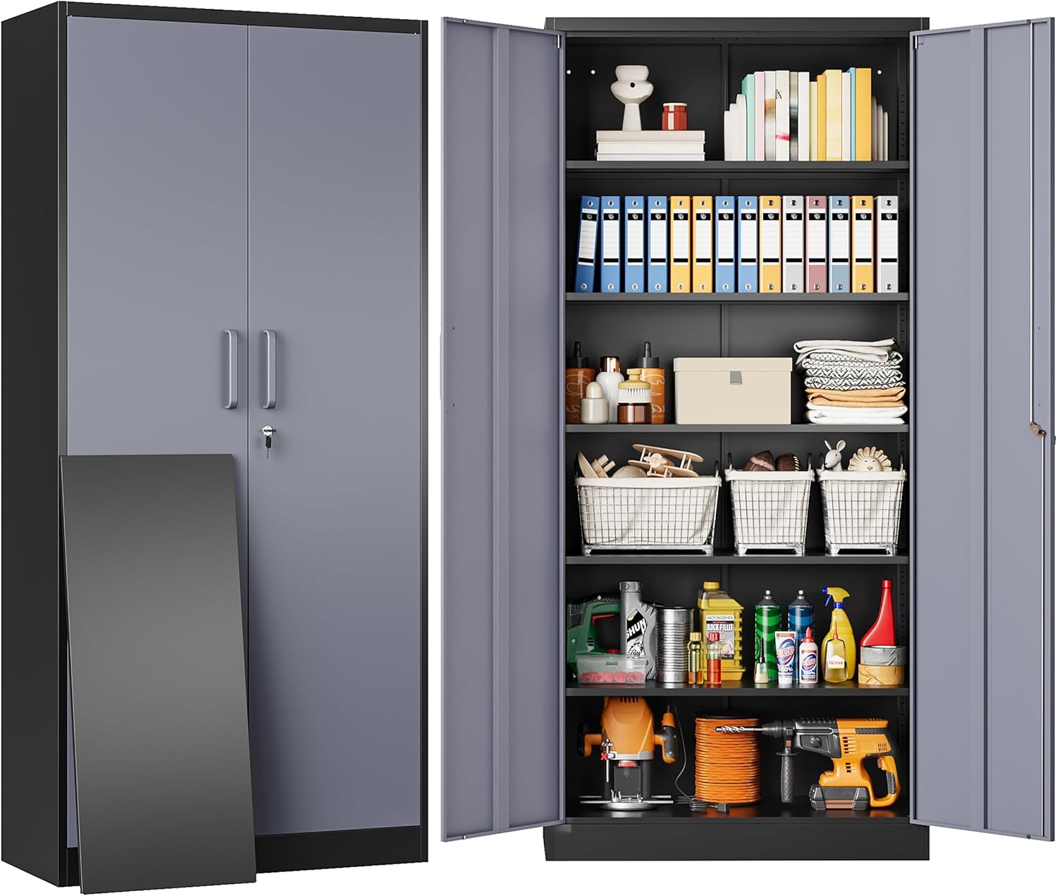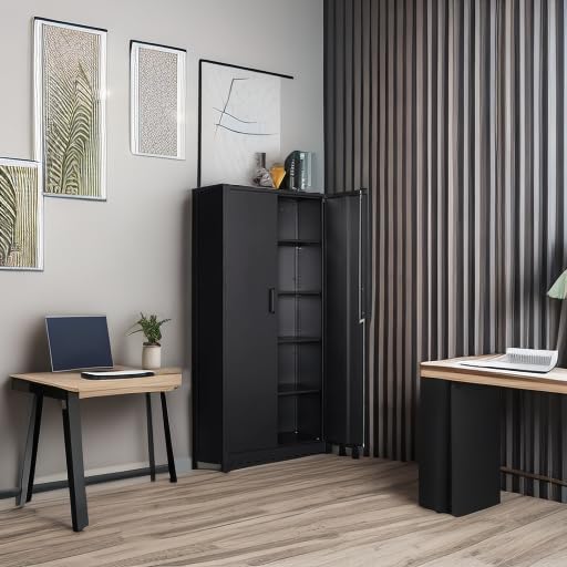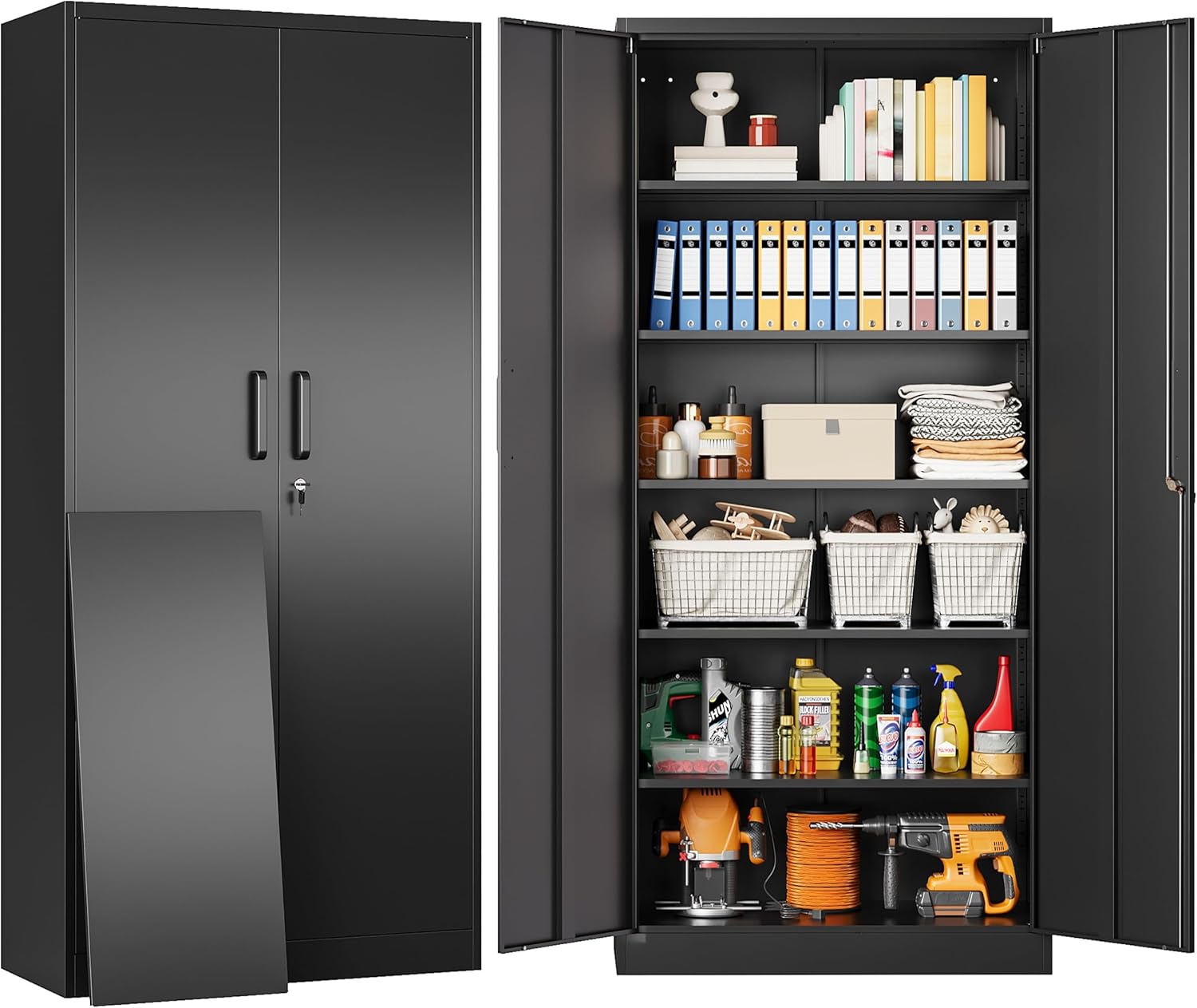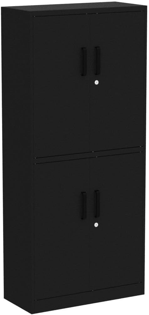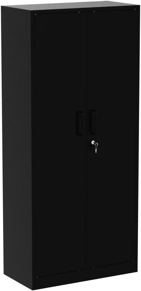 Metal Storage Cabinet with 2 Doors and 6 Shelves, Black Metal Cabinet with Lock, 71 Inch Lockable Garage Storage Cabinet