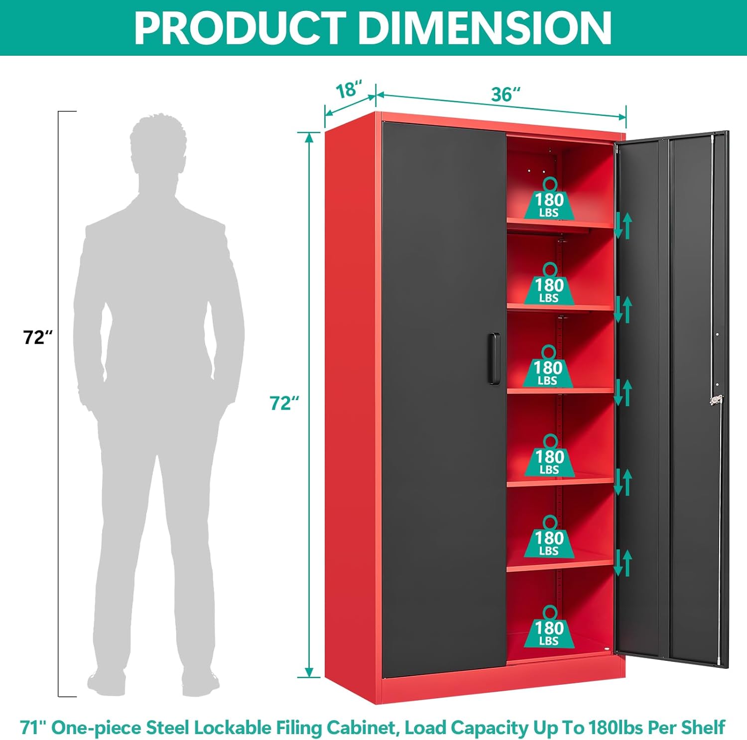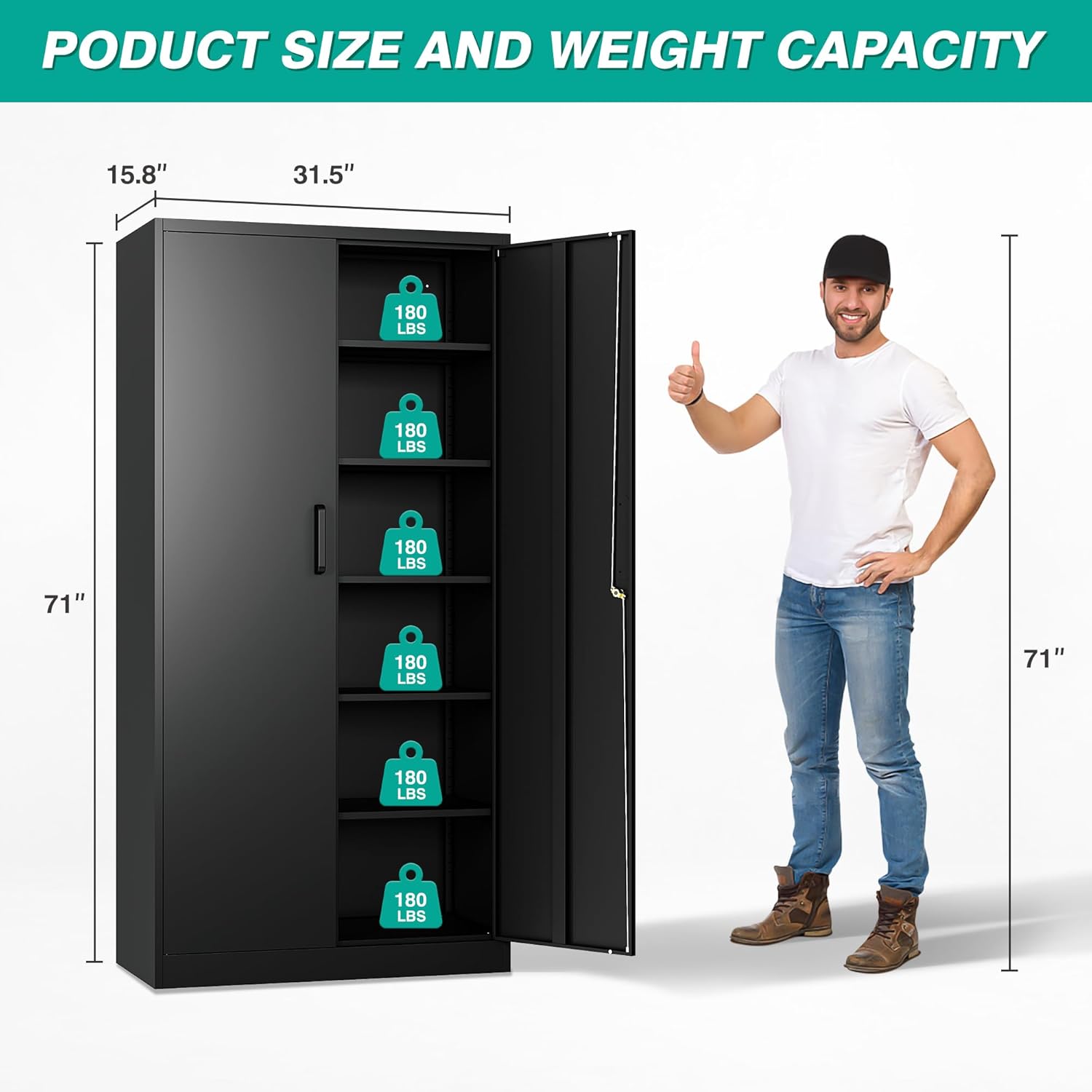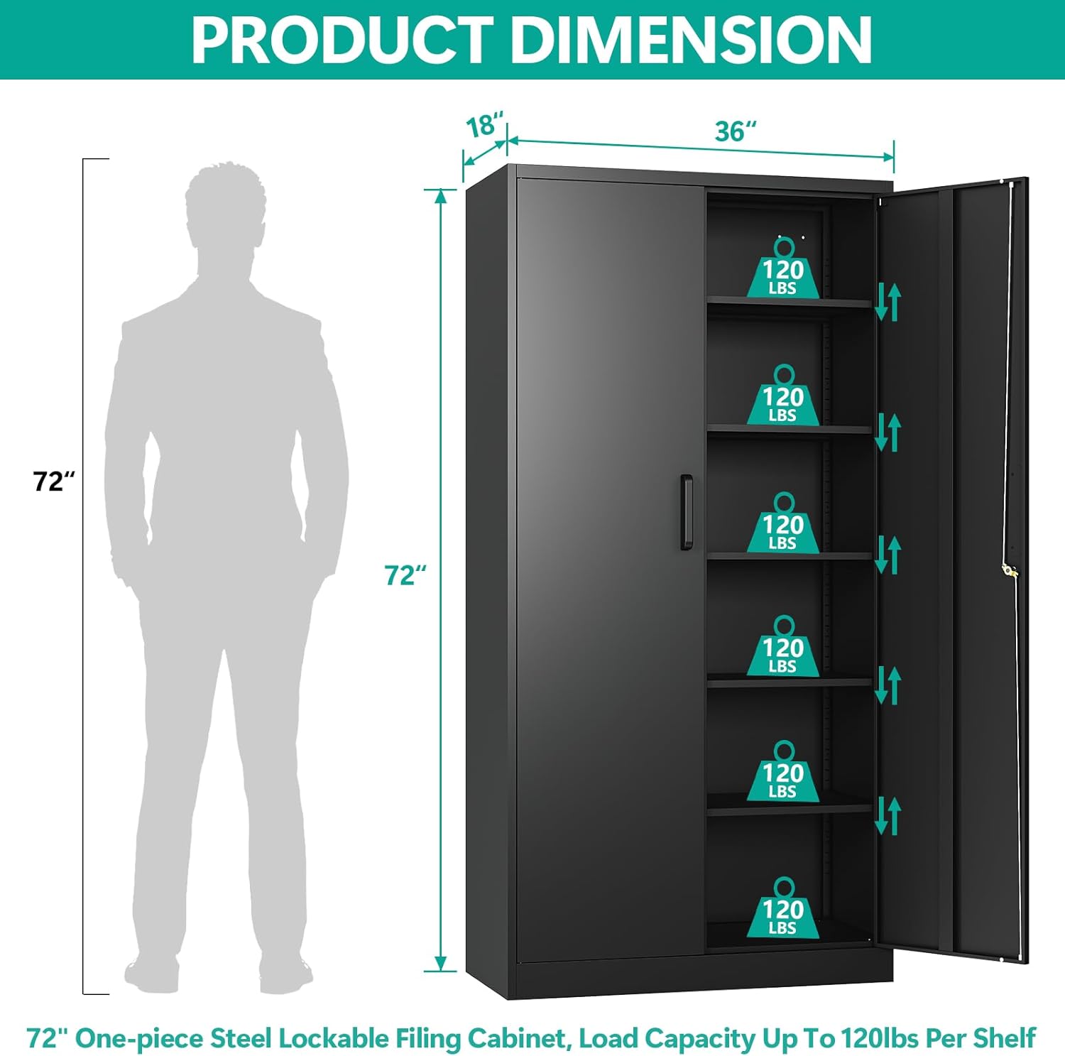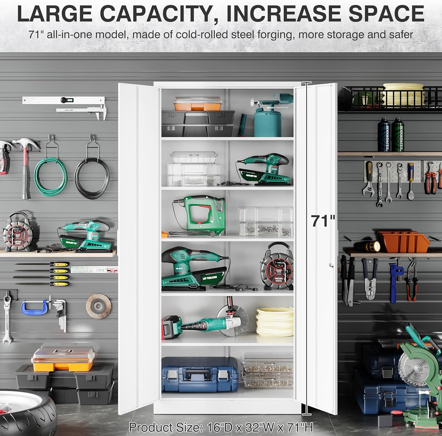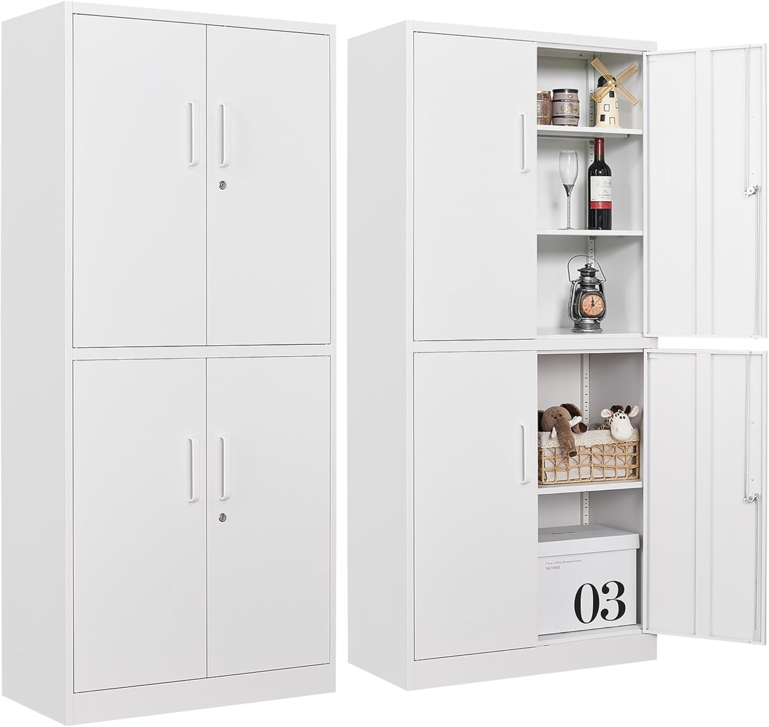Metal Storage Cabinet with 2 Doors and 6 Shelves, Black Metal Cabinet with Lock, 71 Inch Lockable Garage Storage Cabinet