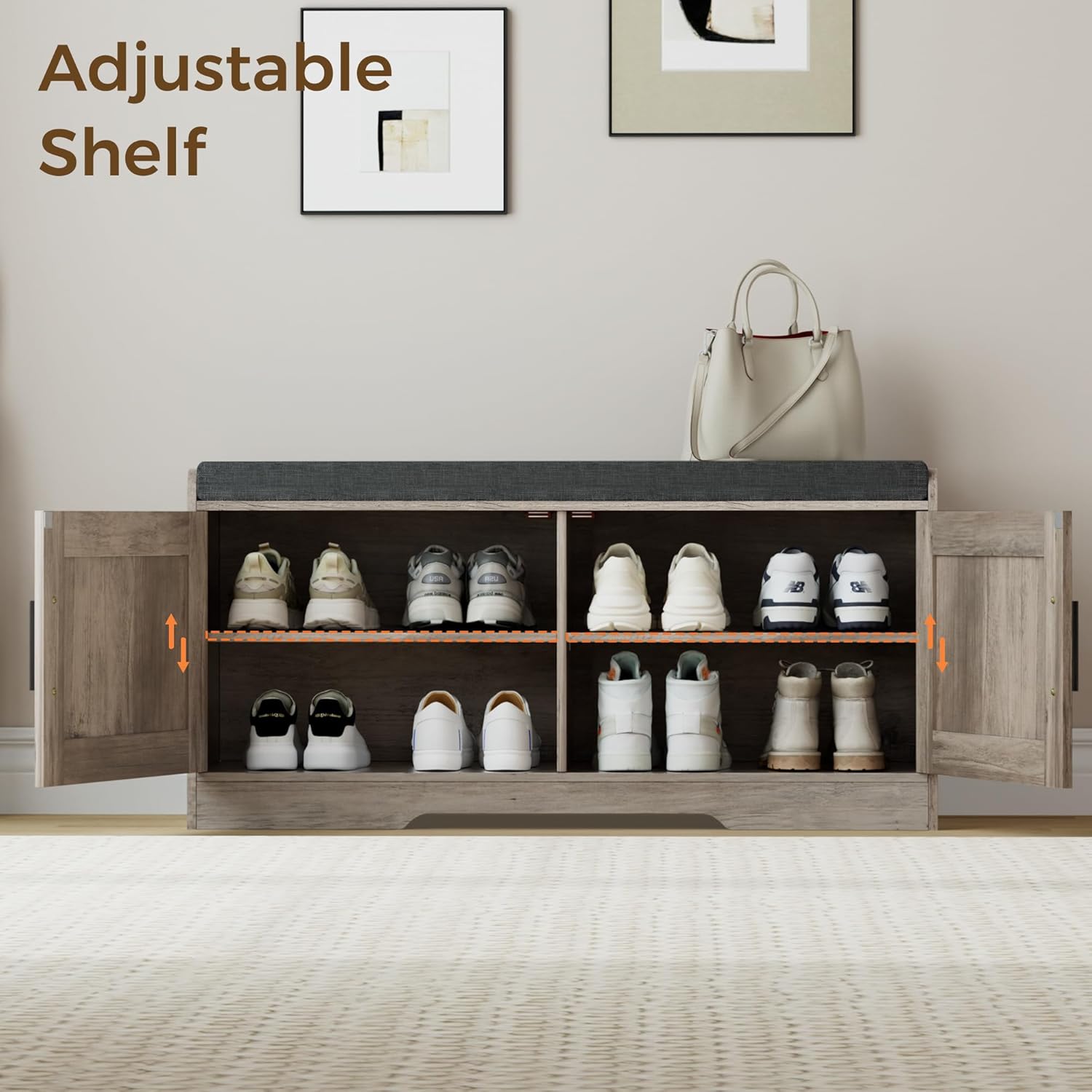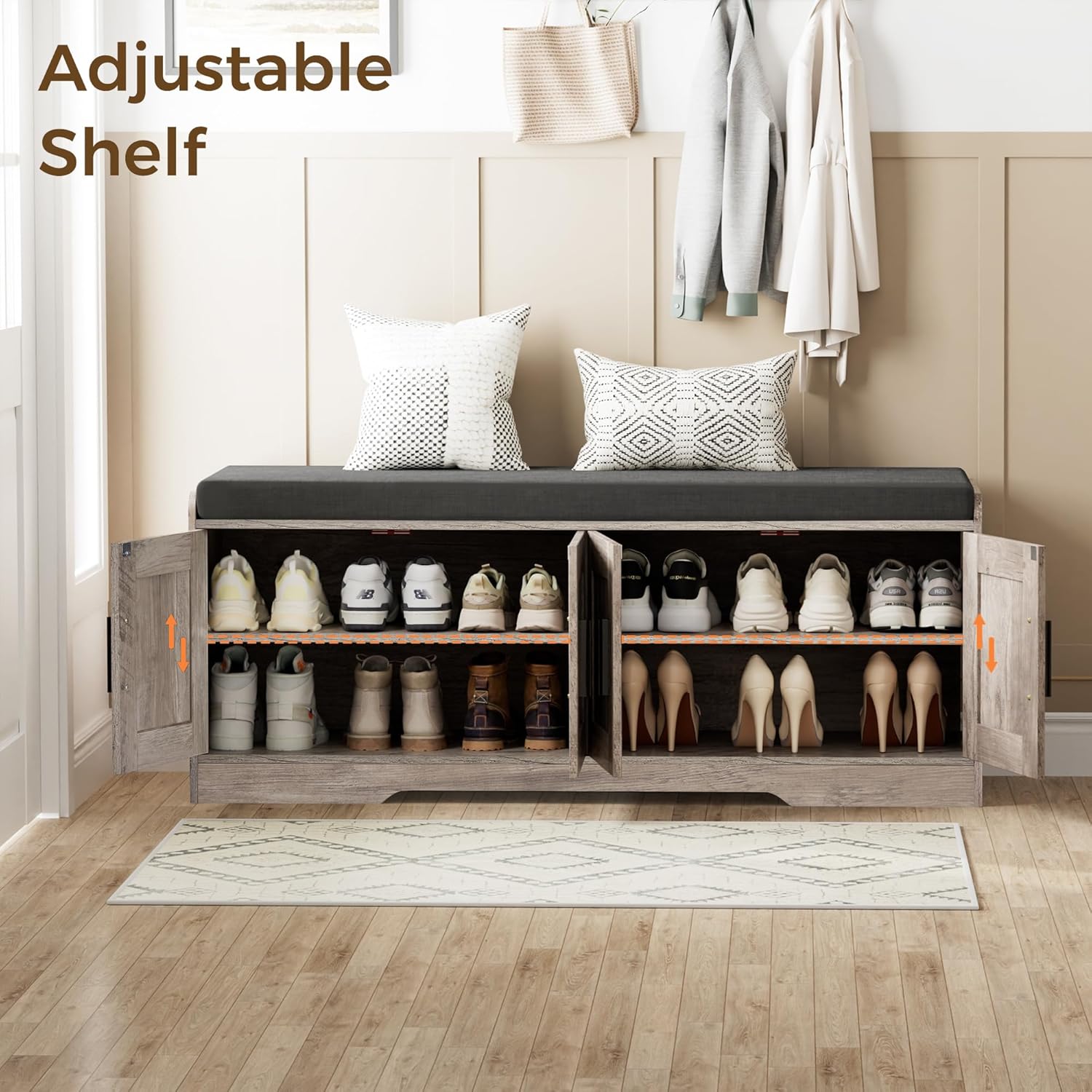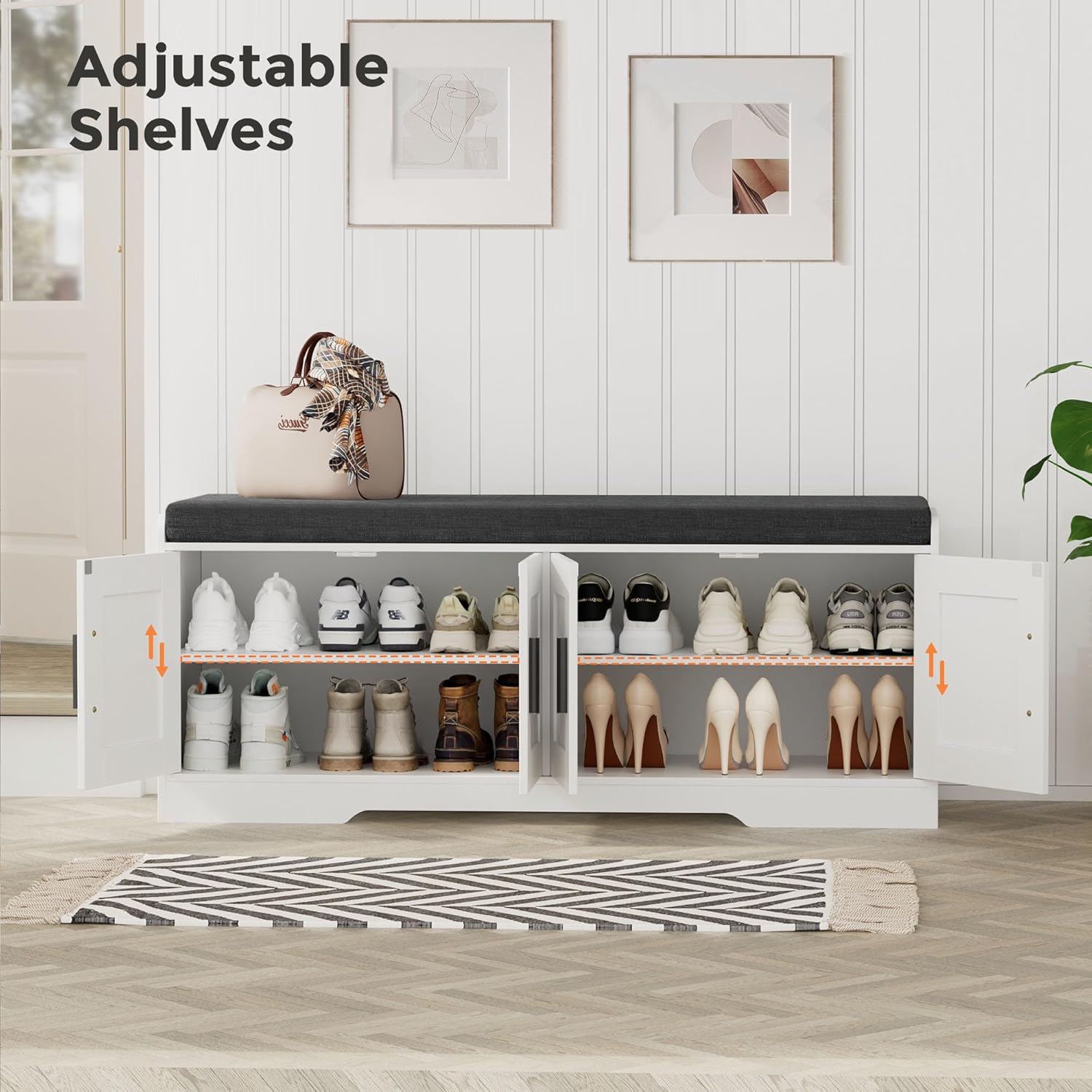 2-Tier Storage Bench, Shoe Bench with Thickened Padded Seat Cushion, Entryway Bench with 4 Doors, Adjustable Shelf