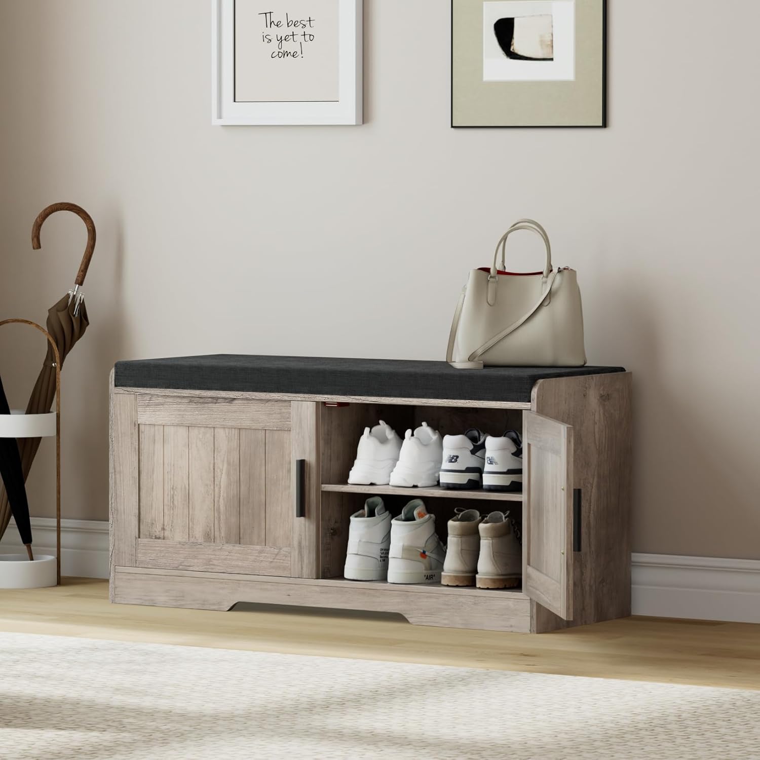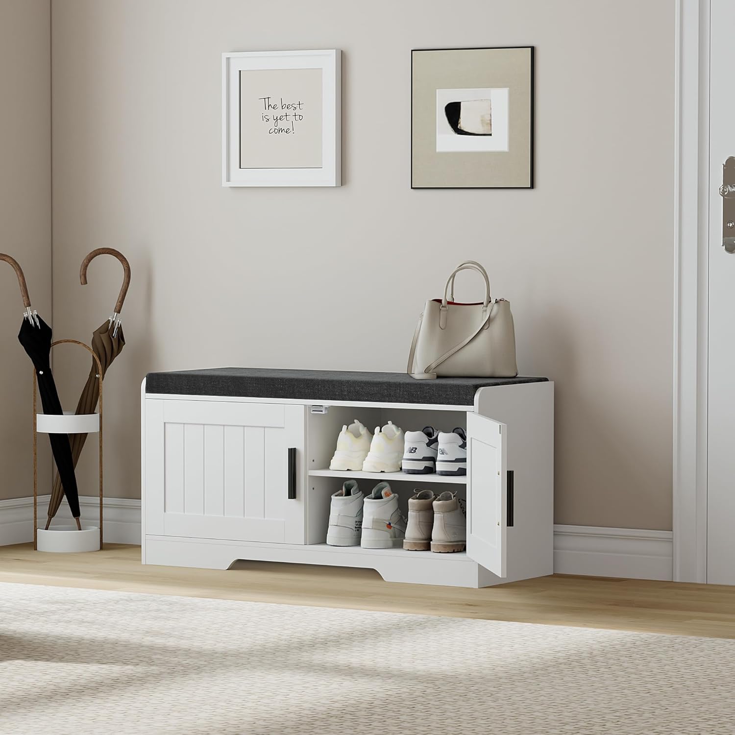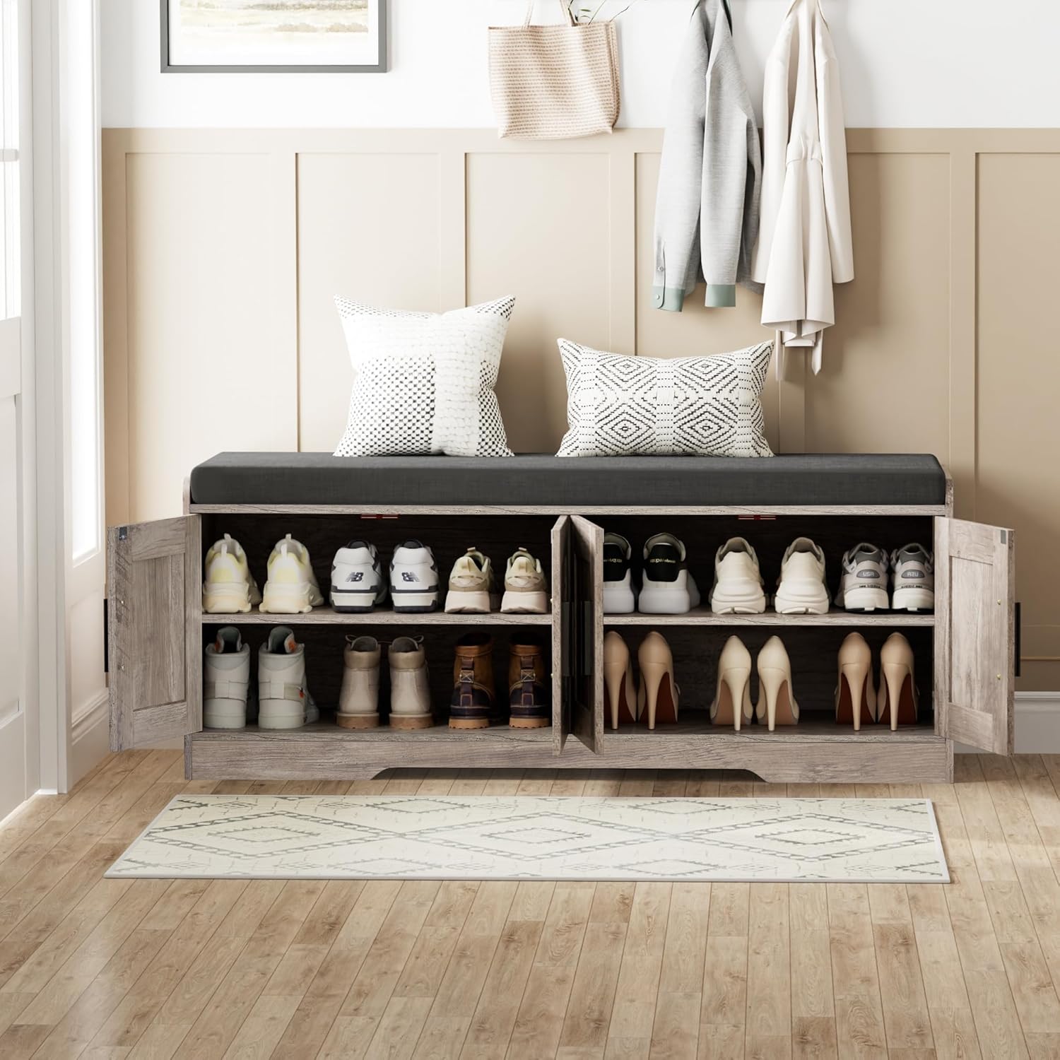 2-Tier Storage Bench, Shoe Bench with Thickened Padded Seat Cushion, Entryway Bench with 4 Doors, Adjustable Shelf