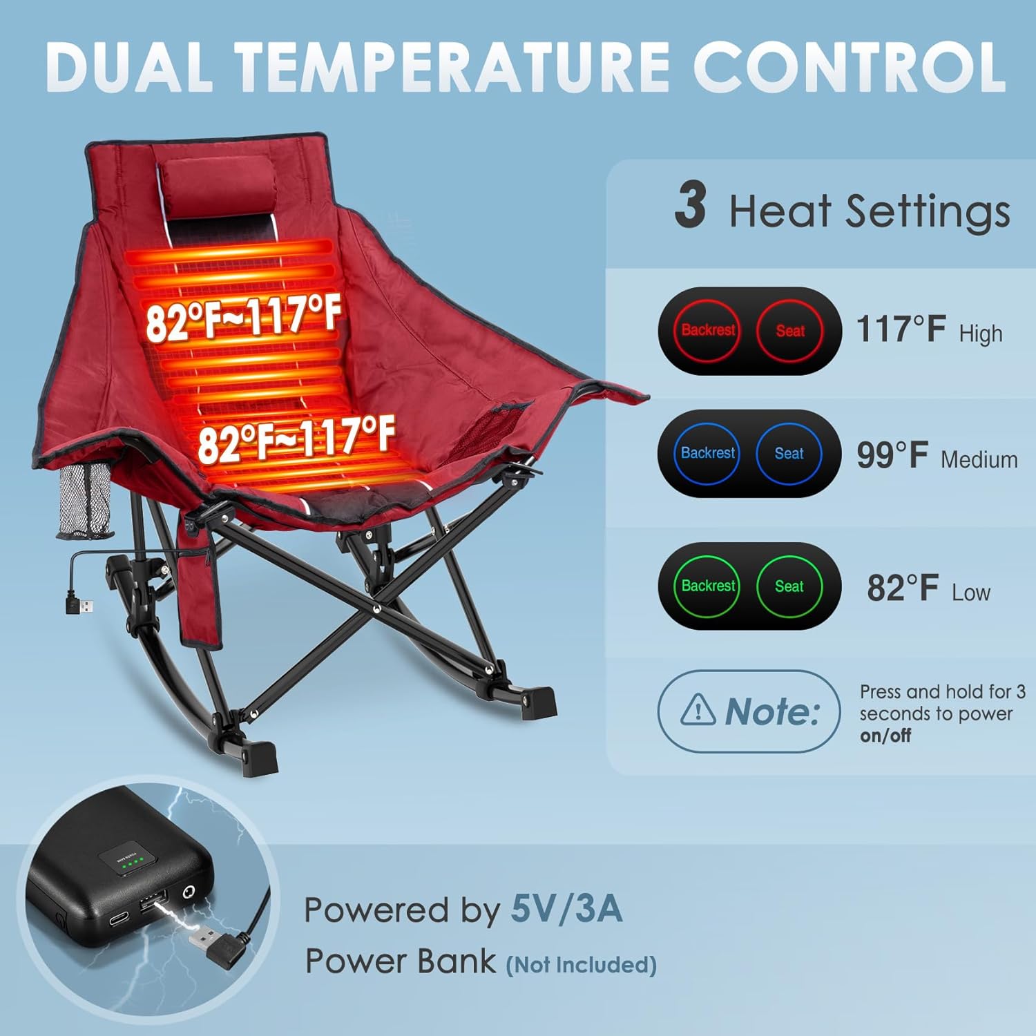 Heated Camping Chair, Extra Large Heated Chair Outdoor Sports Chair with 3 Heat Levels on Back and Seat, Portable Folding Heated Outdoor Chair (Batteries Not Included)