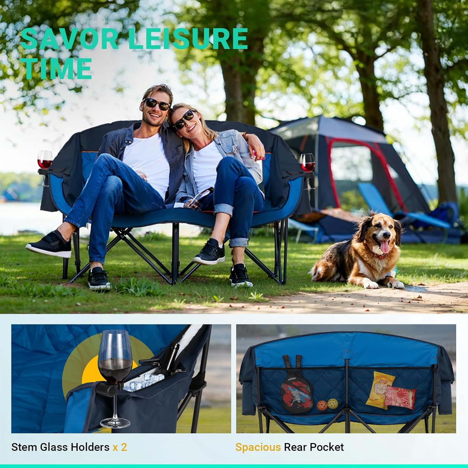 Double camping chair (with cooler bag), extra wide love seat, heavy duty padded camping sofa, portable folding chair