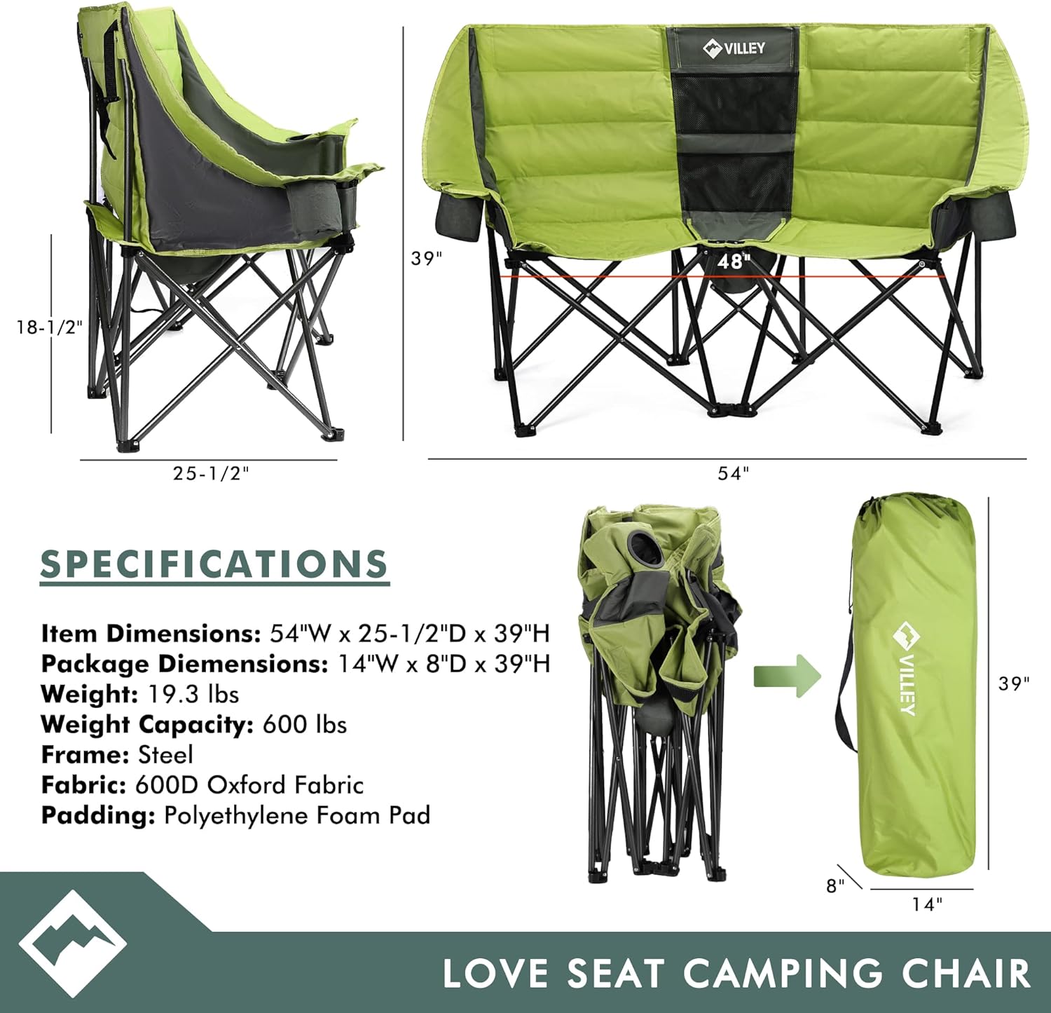 Camping Chair Upholstered Loveseat - Heavy Duty Extra Large Camping Sofa Portable Folding Sofa with Cup Holder and Carry Bag