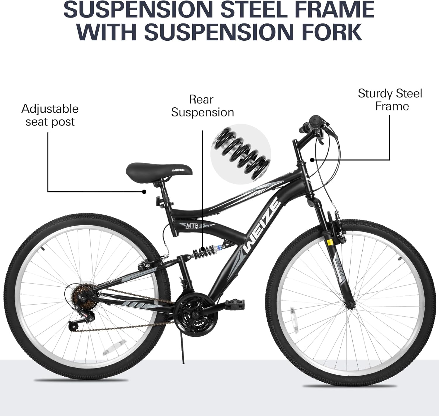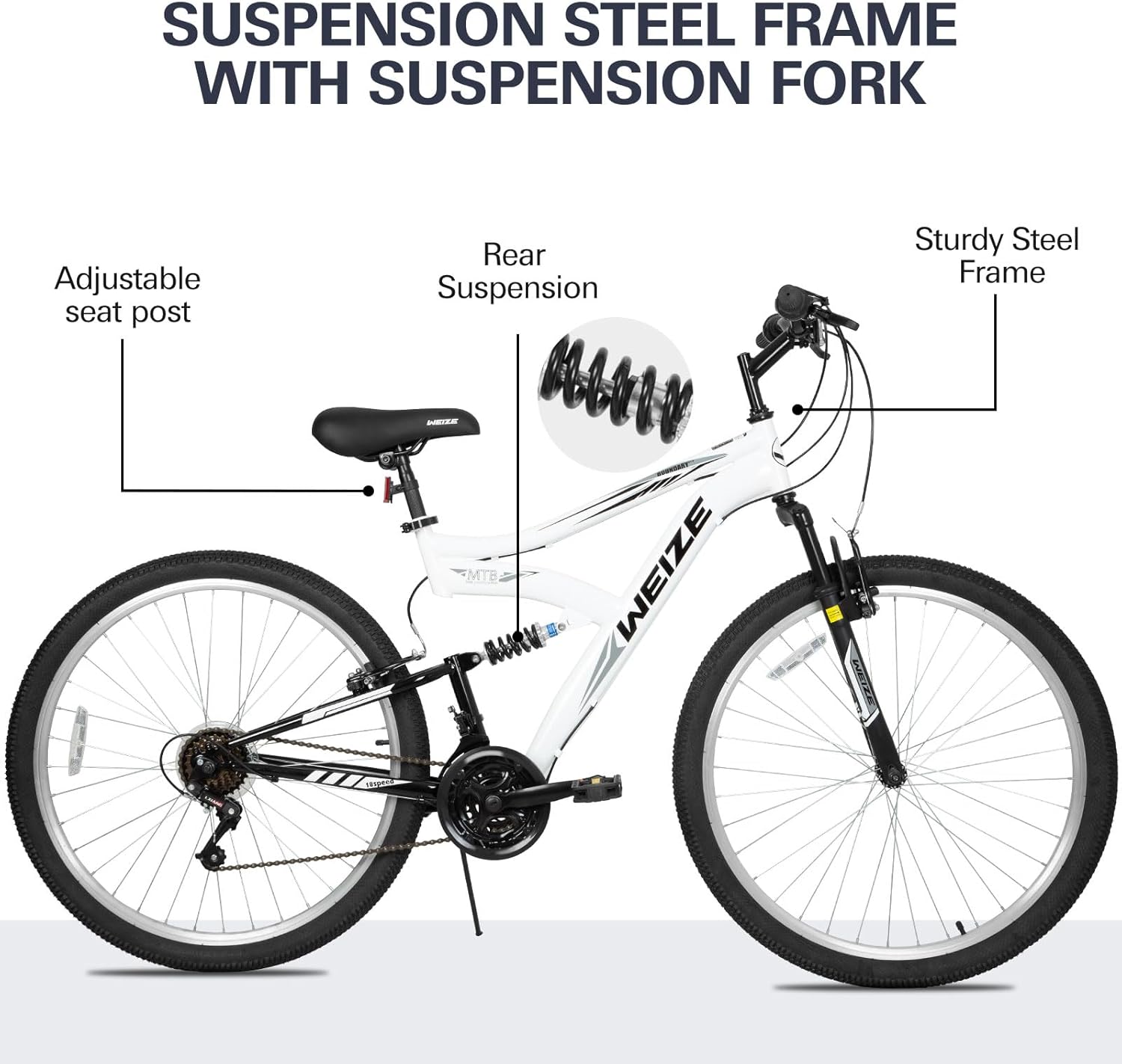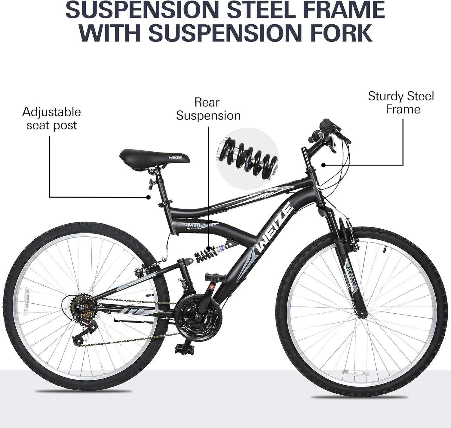 WEIZE Mountain Bike, 26 27.5 inch Outdoor Hybrid Bikes,18-Speed/High-Carbon Steel/Dual Full Suspension, Adjustable Ergonomic Seat for Men Women Adult, MTB Bicycle with Suspension Fork,Sleek Colors
