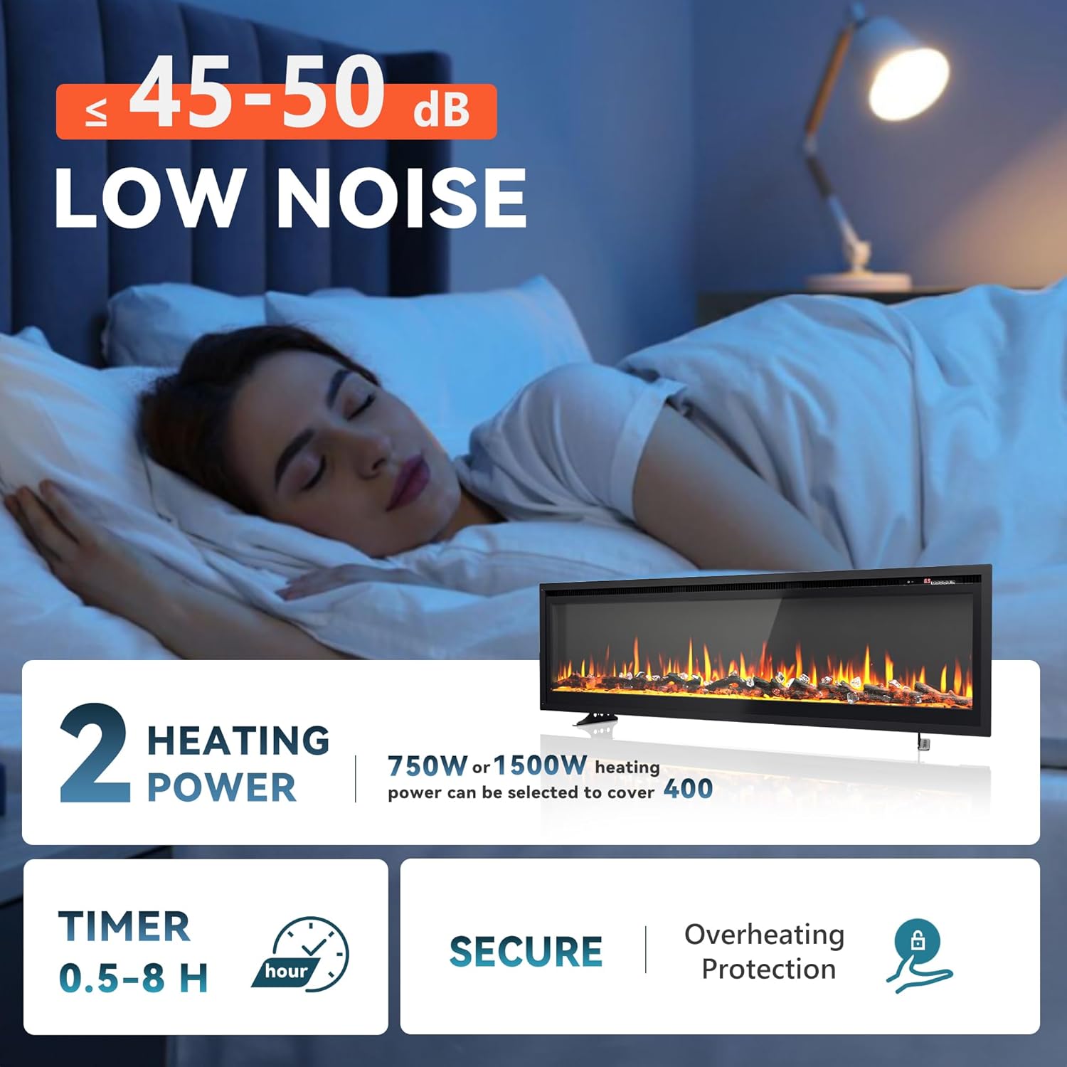 R.W.FLAME 60" Recessed and Wall Mounted Electric Fireplace, Low Noise, Fit for 2 x 6 Stud, Remote Control with Timer, Touch Screen, Adjustable Flame Color and Speed, 750-1500W
