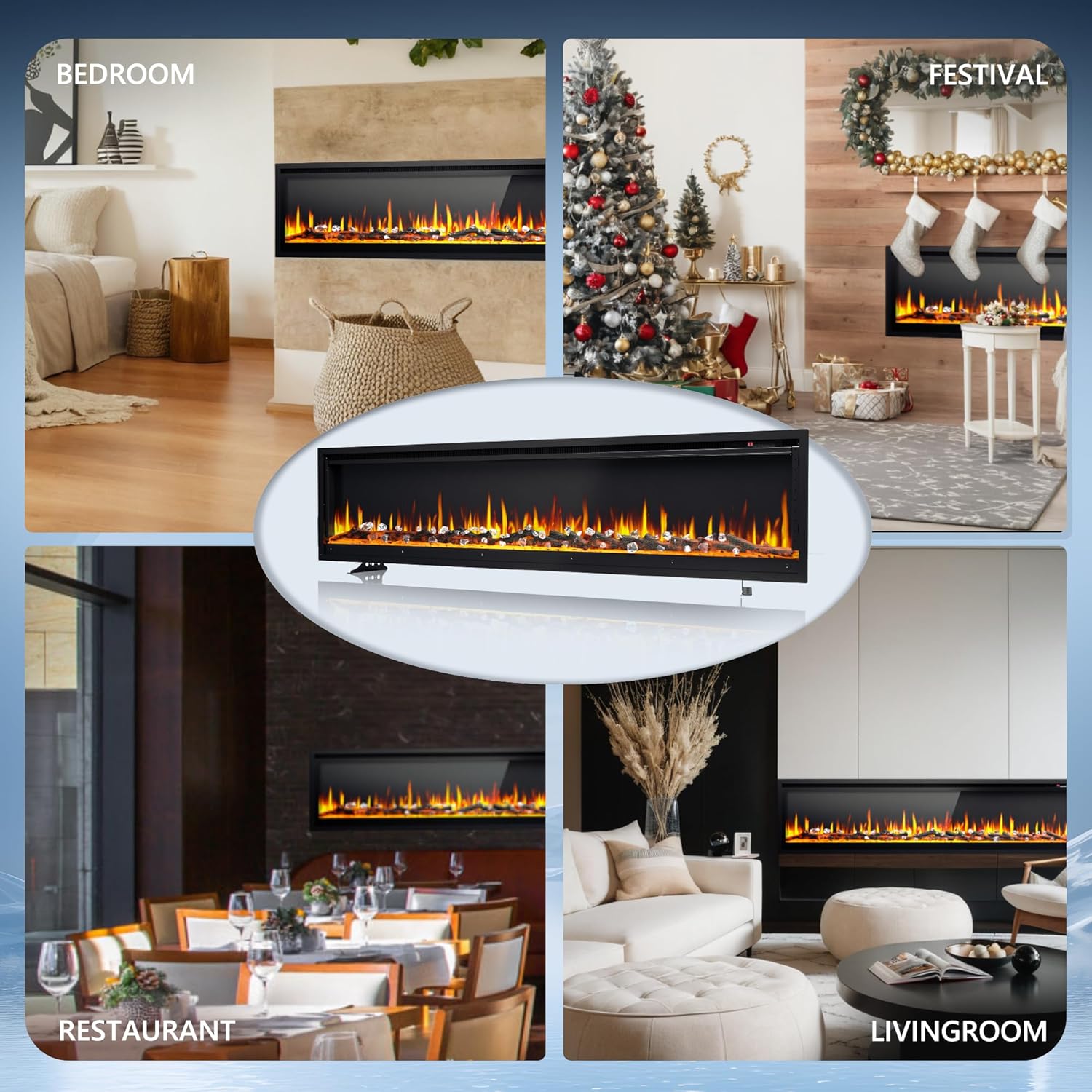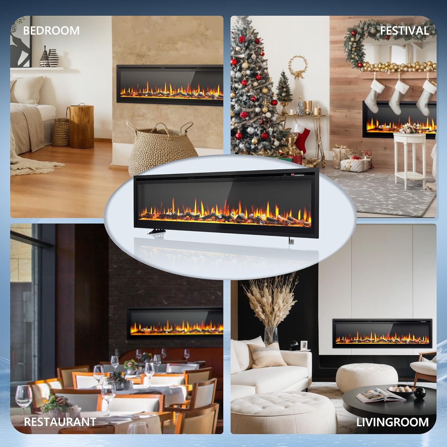 Electric Fireplace 60Inch,Wall Mounted Electric Fireplace Heater with Timer Inserts,TV Stand Touch Screen and Realistic Flame,Log Set,Crystal Flames 750 to 1500W,Remote for Living Room