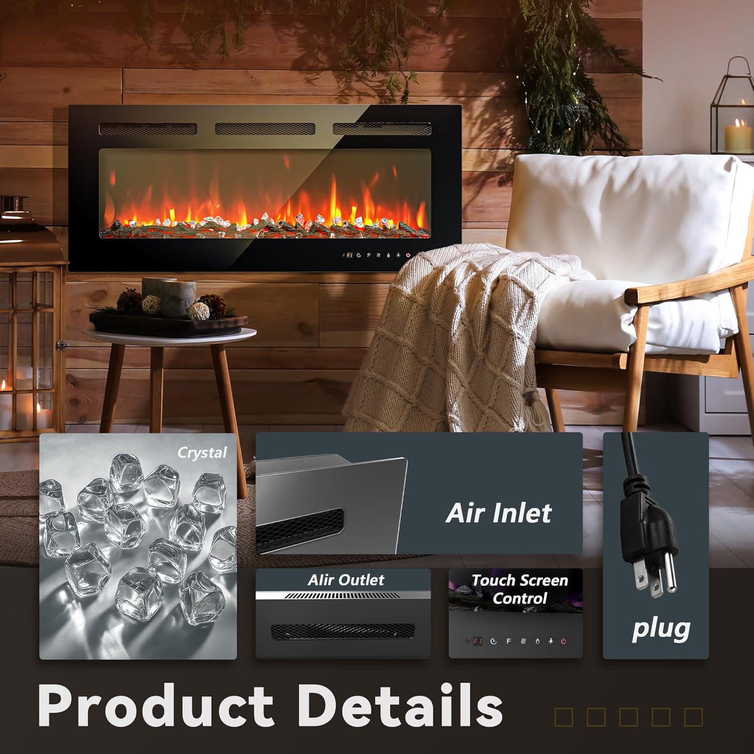 EUHOMY 50 Inch Electric Fireplace Wall Recessed and Wall Mounted with Adjustable Flame Color, Fireplace Heater with Remote Control, Linear Fireplace with Timer, Touch Screen, Log & Crystal, 750/1500W