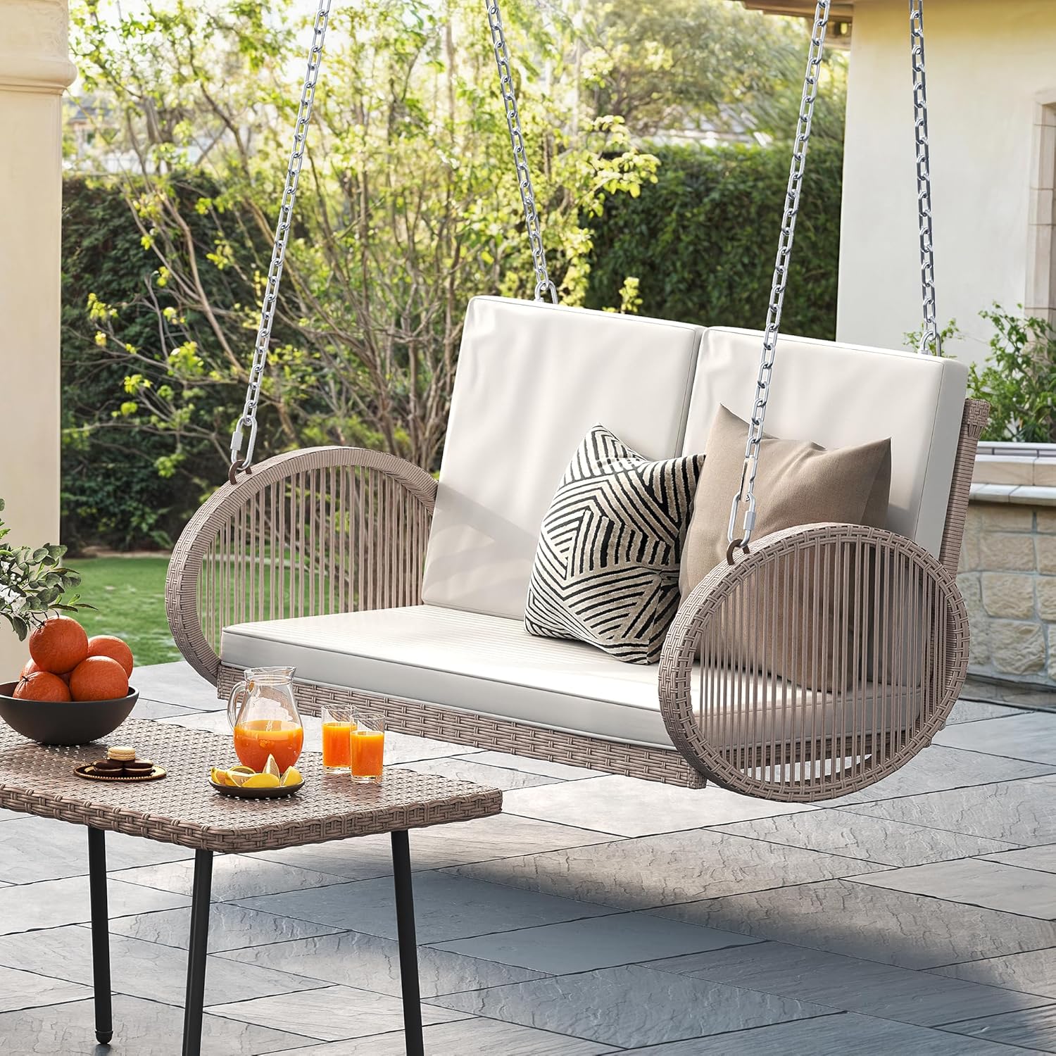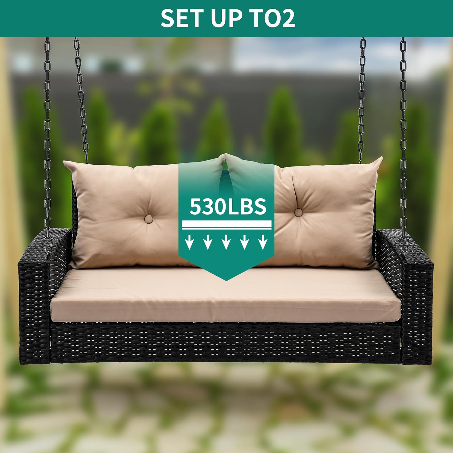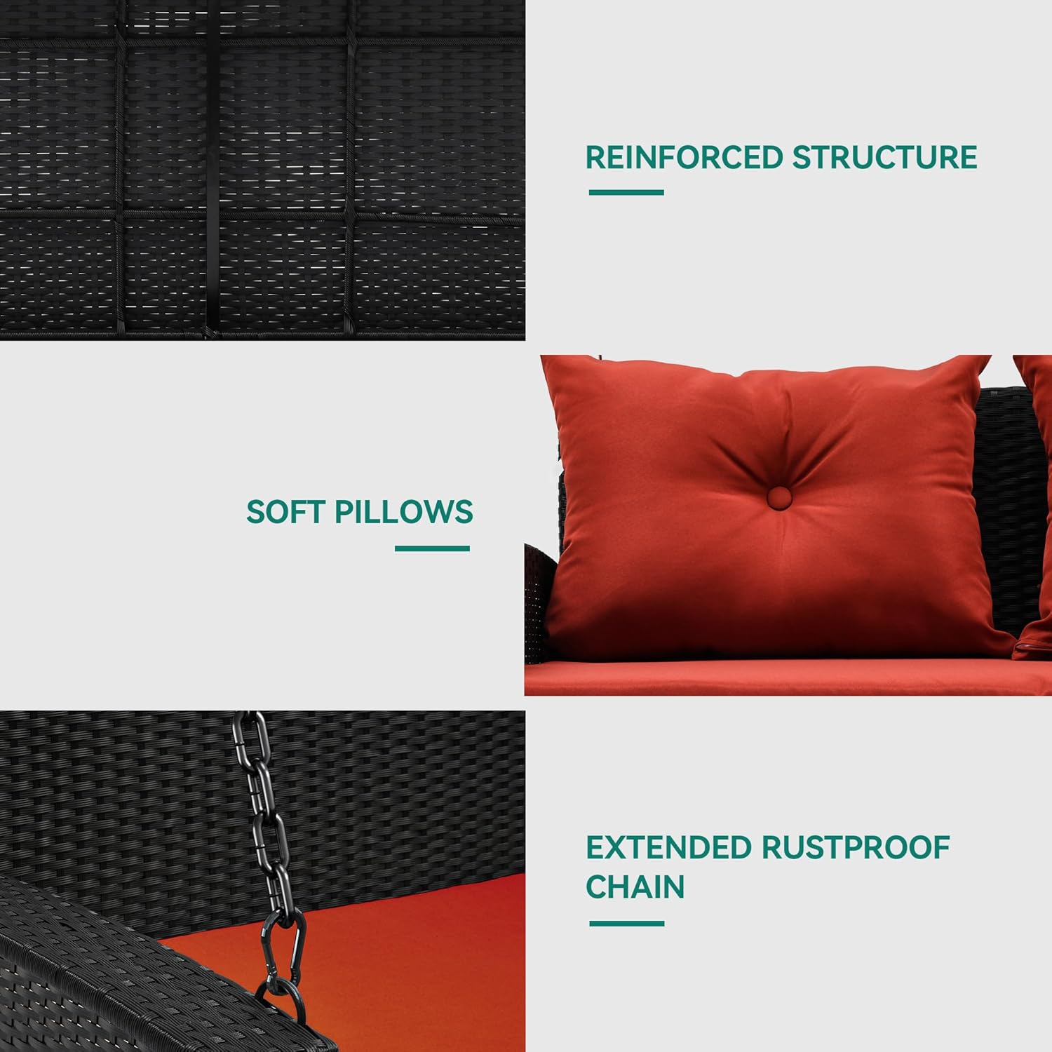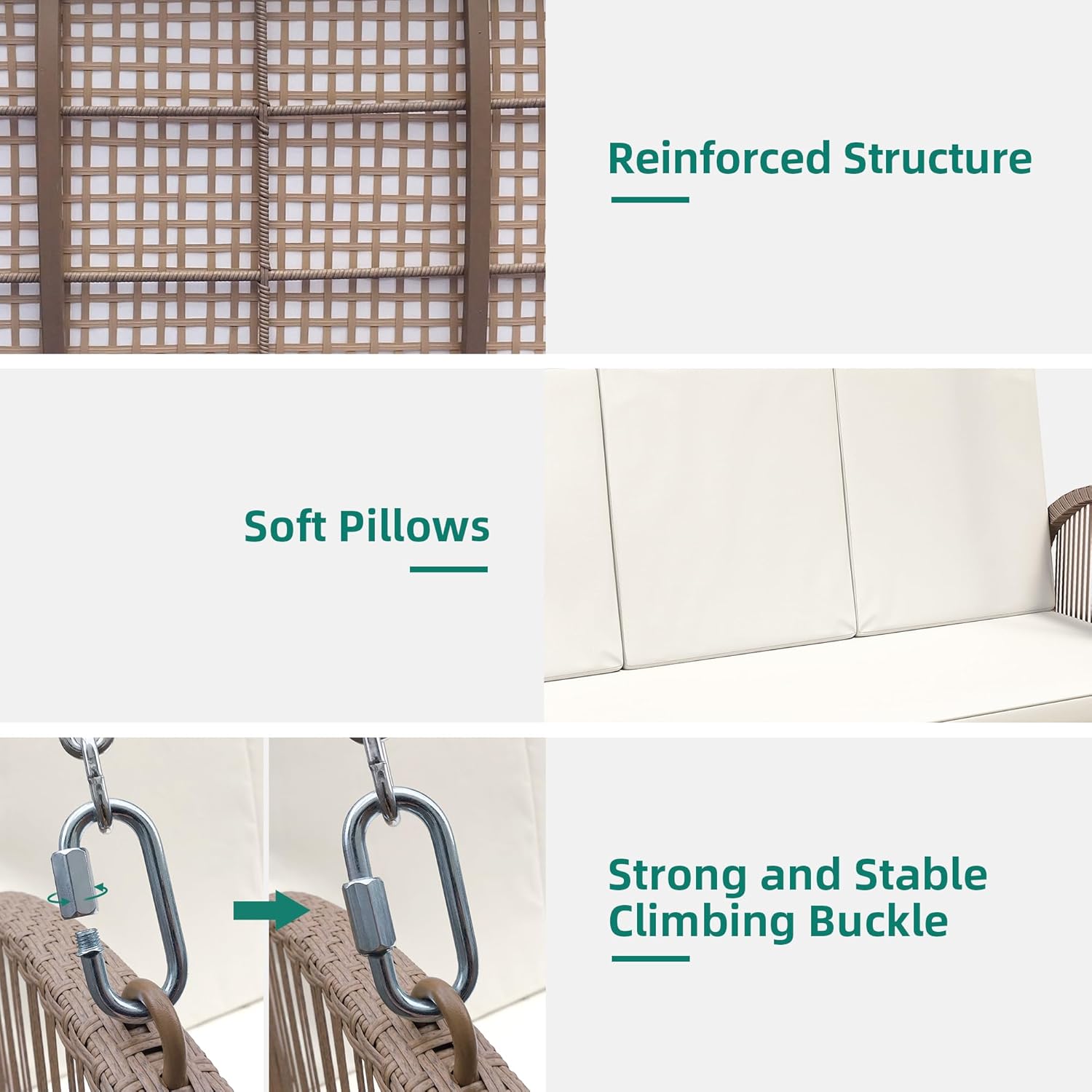 YITAHOME Hanging Porch Swing Chair Sits 3 People, Wicker Outdoor Swing Bench, Patio Lounge Chair, 1 Seating Cushion and 3 Back Cushions, w/Removable Covers, for Garden, Balcony, Backyard, Brown